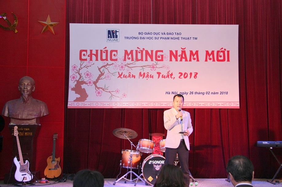 Sau chương trình nghệ thuật do giảng viên, sinh viên Nhà trường biểu diễn, TS. Đào Đăng Phượng – Bí thư Đảng ủy, Hiệu trưởng Nhà trường phát biểu và gửi những lời chúc tốt đẹp nhất đến toàn thể cán bộ, giảng viên, học viên, sinh viên nhân dịp năm mới. Đồng thời, TS. Đào Đăng Phượng cũng bày tỏ hy vọng trong năm 2018, tập thể cán bộ, giảng viên Nhà trường sẽ tiếp tục đoàn kết, phấn đấu và quyết tâm hơn nữa để hoàn thành xuất sắc những kế hoạch đã đề ra, góp phần vào sự phát triển chung của Trường Đại học Sư phạm Nghệ thuật Trung ương.