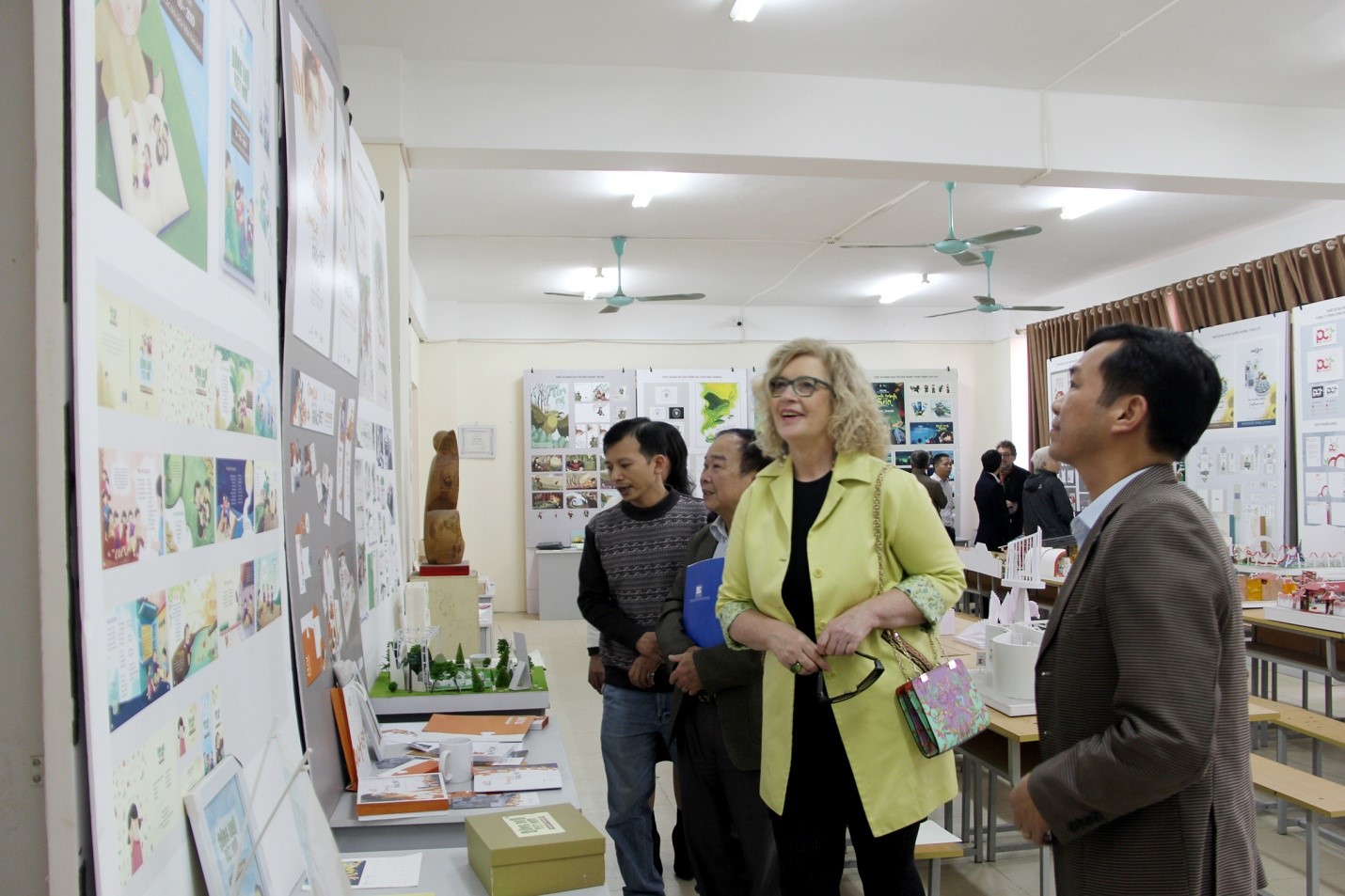 Sau buổi tiếp, đoàn công tác Tập đoàn Lehmbaugruppe – Leipzig tham quan thực tế phòng trưng bày của khoa Thiết kế Thời trang và phòng trưng bày sản phẩm thiết kế của sinh viên khoa Thiết kế Đồ họa.