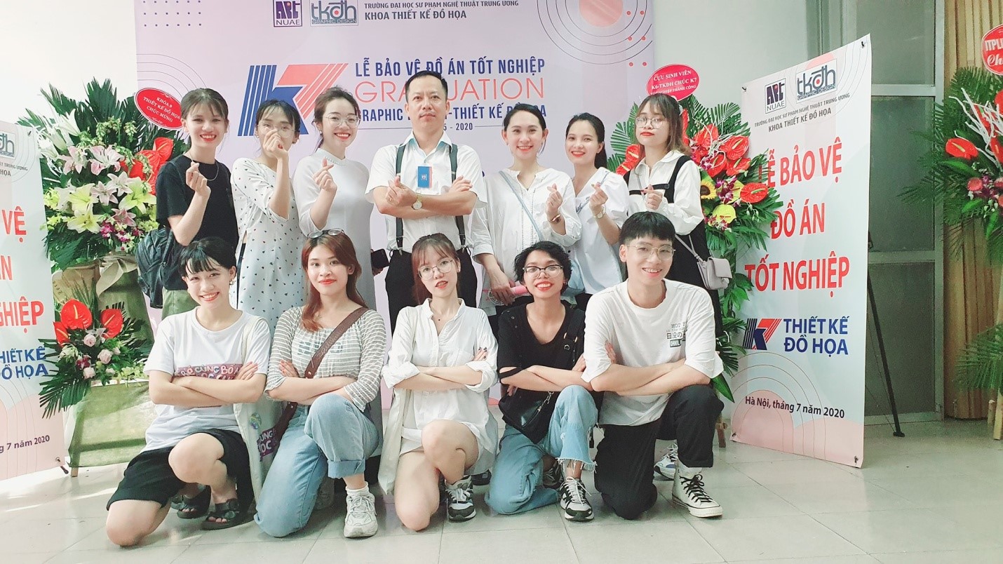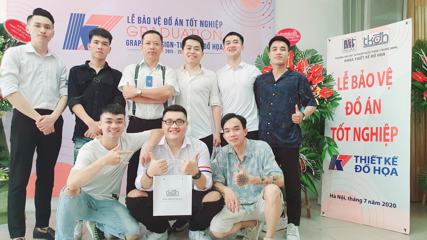 Thầy Nguyễn Hồng Sơn bên các sinh viên Thiết kế Đò họa trong ngày Bảo vệ Đồ án tốt nghiệp 2020