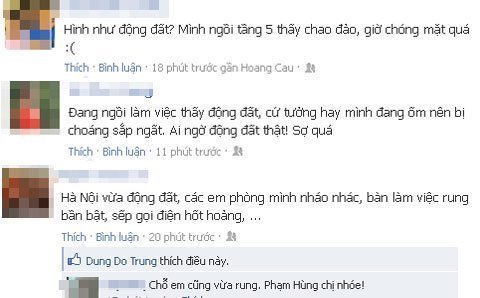 Ngay sau đó, trên các trang cá nhân như facebook nhiều người đã chia sẻ những dòng status về động đất như: “Hình như vừa có động đất?”; “Sợ quá động đất cả nhà ạ”; “Chuyện lạ, Hà Nội có động đất”…