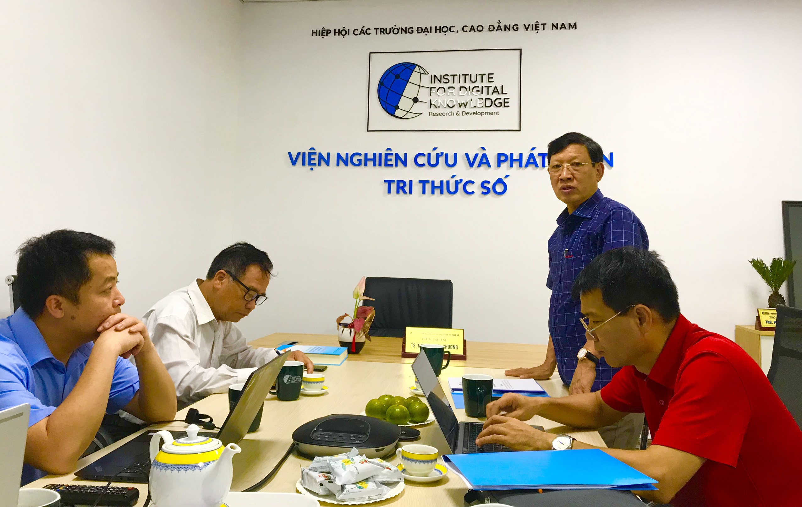 Hiệu trưởng và đại diện lãnh đạo NUAE làm việc với Viện Nghiên cứu và Phát triển Tri thức số về triển khai xây dựng Thư viện số và kết nối Thư viện số dùng chung