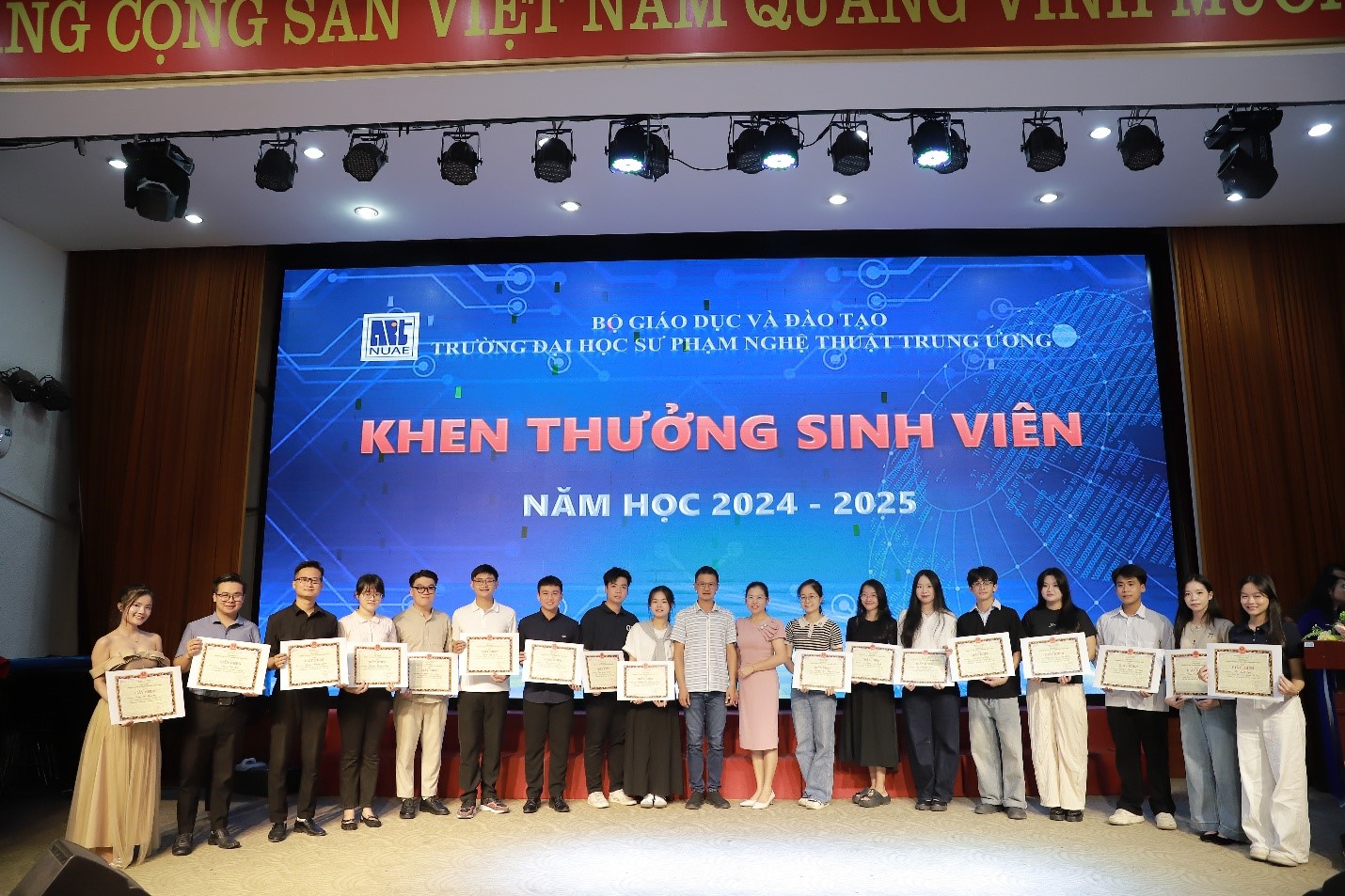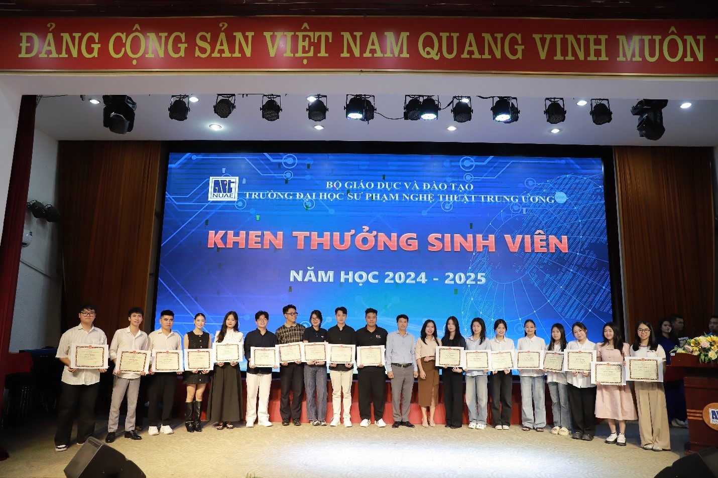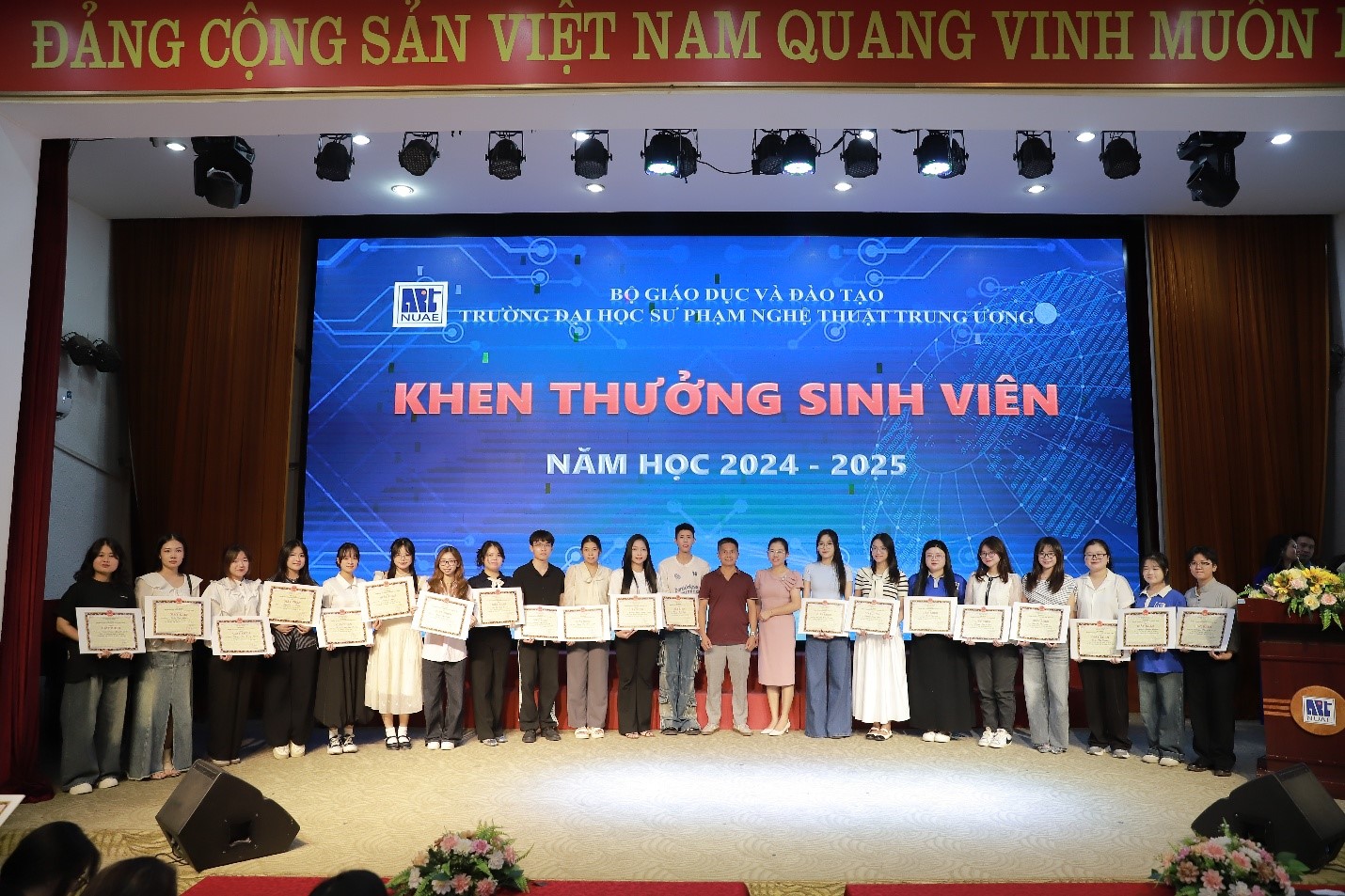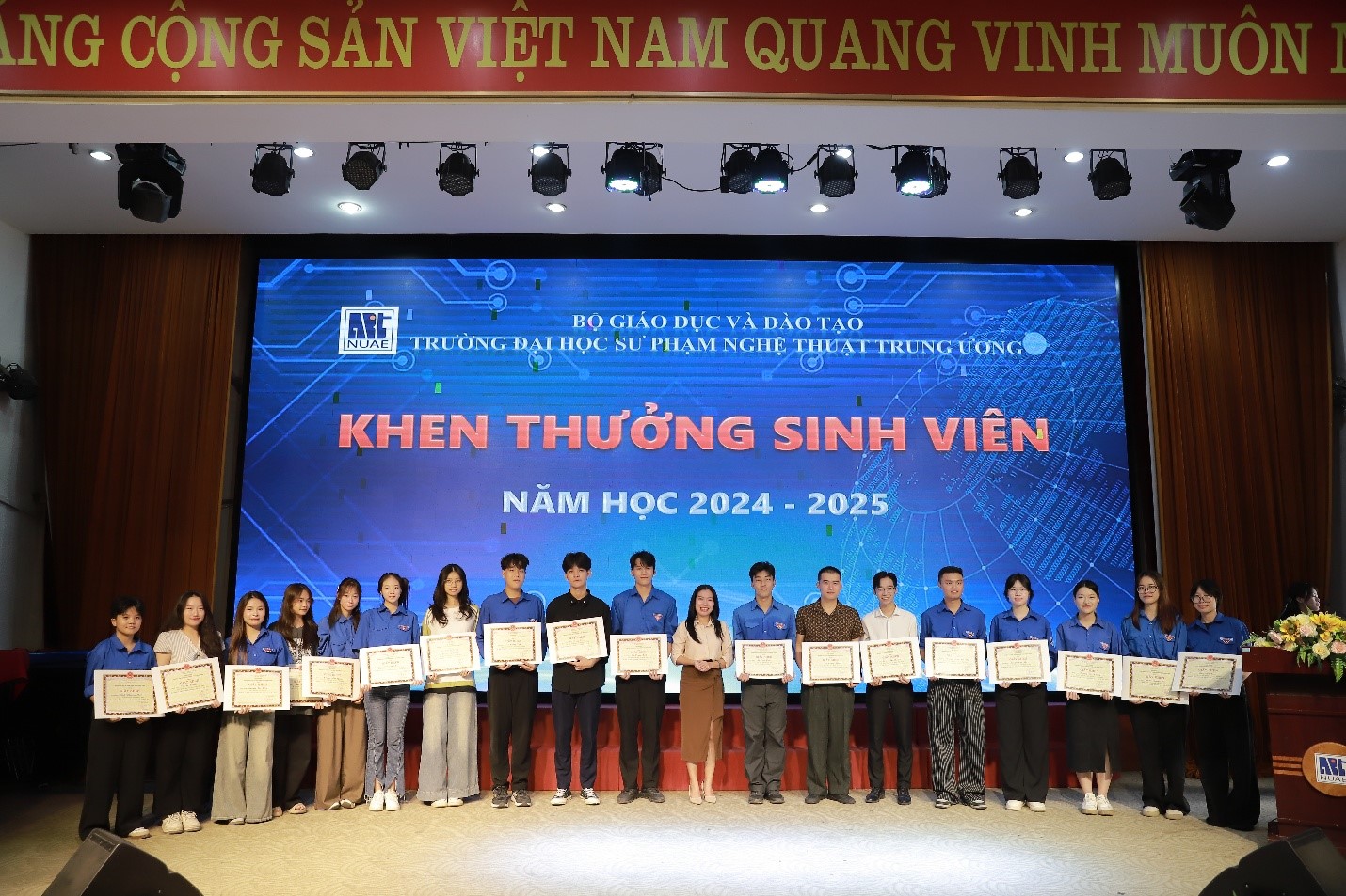 Thông qua giao ban công tác sinh viên đầu năm học 2025-2026 cũng là dịp để Nhà trường trao khen thưởng cho tập thể, cá nhân sinh viên có thành tích tốt trong học tập và rèn luyện năm học 2024-2025. Bên cạnh đó, Nhà trường trao khen thưởng cho sinh viên tình nguyện, sinh viên tự quản tích cực hoạt động phong trào trong năm học qua và sinh viên tham gia nhiệm vụ A80. Mong rằng trong năm học tới, các bạn sinh viên tích cực hơn nữa trong học tập, rèn luyện và các hoạt động phong trào để góp phần xây dựng Trường ĐHSP Nghệ thuật TW ngày càng phát triển vững mạnh.
