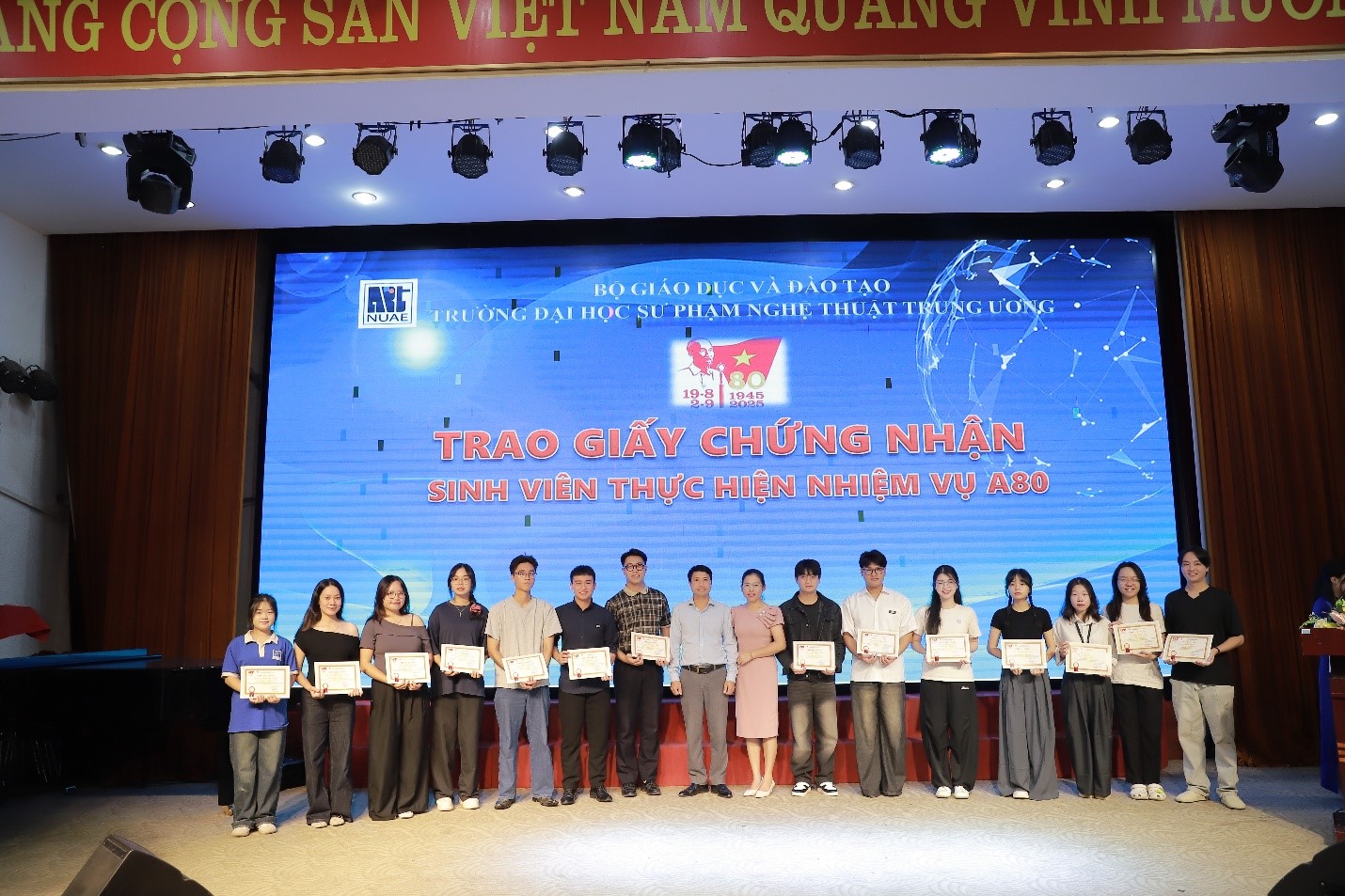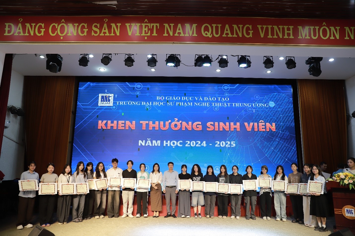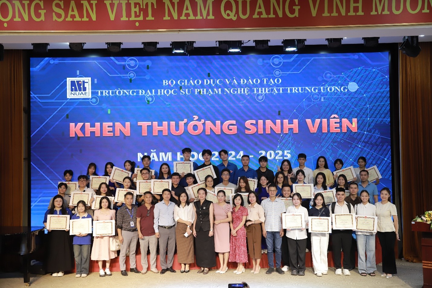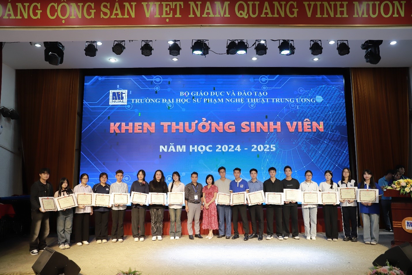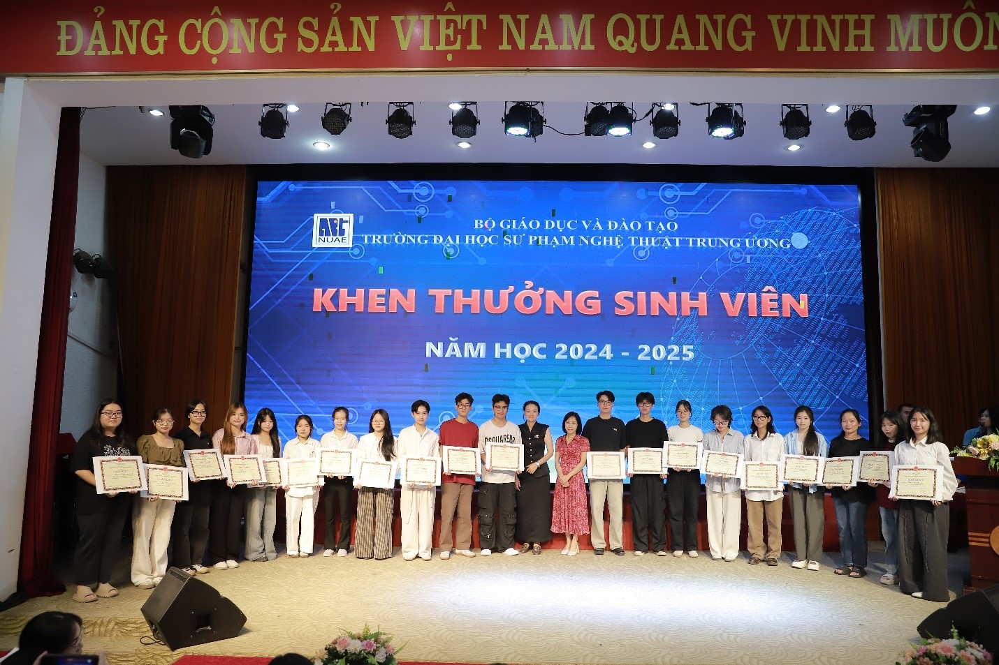 Thông qua giao ban công tác sinh viên đầu năm học 2025-2026 cũng là dịp để Nhà trường trao khen thưởng cho tập thể, cá nhân sinh viên có thành tích tốt trong học tập và rèn luyện năm học 2024-2025. Bên cạnh đó, Nhà trường trao khen thưởng cho sinh viên tình nguyện, sinh viên tự quản tích cực hoạt động phong trào trong năm học qua và sinh viên tham gia nhiệm vụ A80. Mong rằng trong năm học tới, các bạn sinh viên tích cực hơn nữa trong học tập, rèn luyện và các hoạt động phong trào để góp phần xây dựng Trường ĐHSP Nghệ thuật TW ngày càng phát triển vững mạnh.