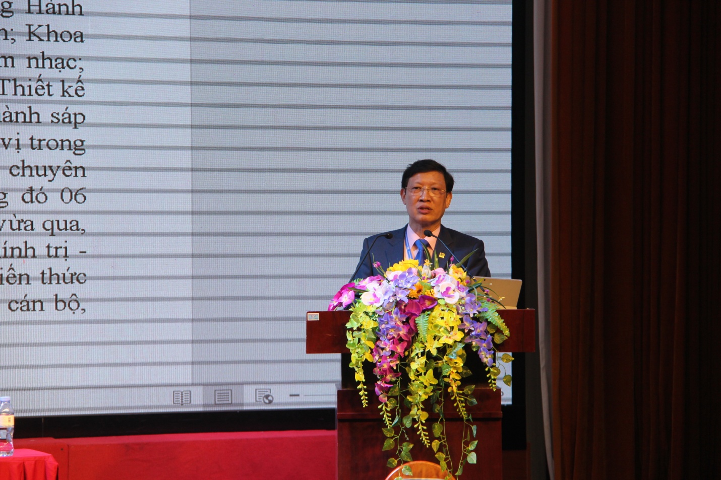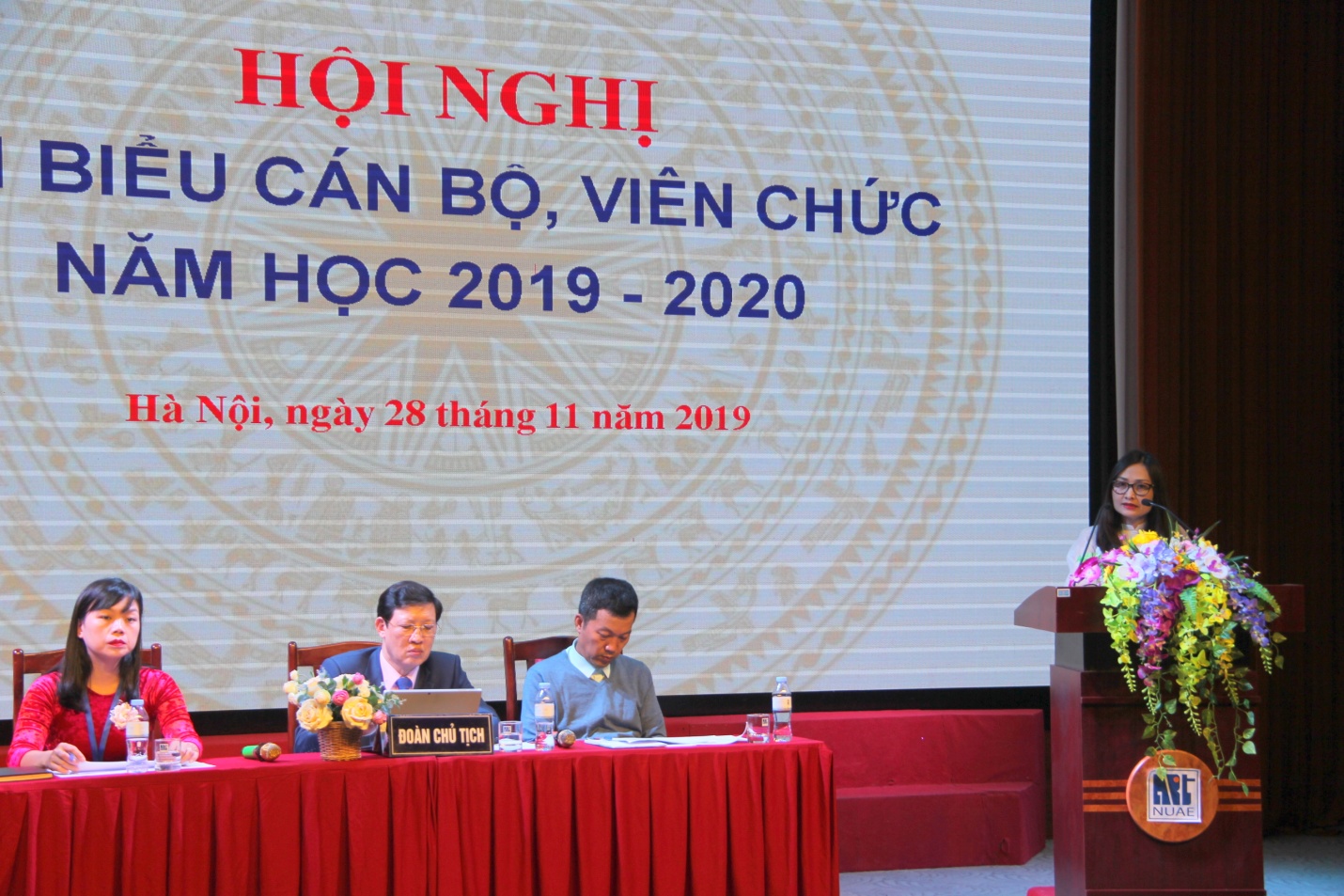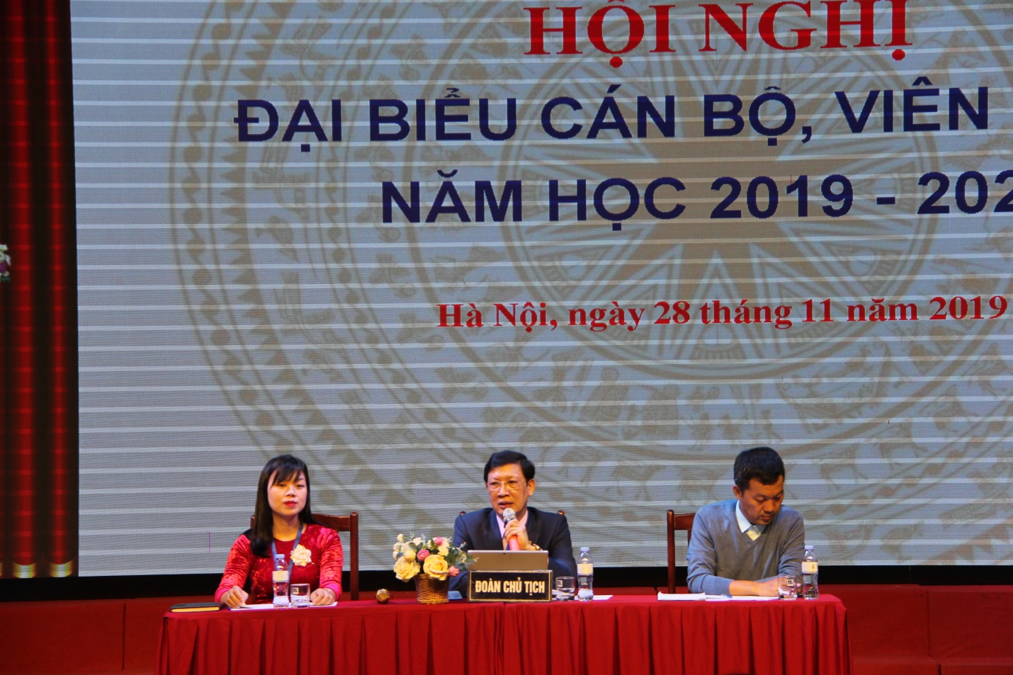 Thay mặt đoàn Chủ tịch, PGS.TS. Đào Đăng Phượng – Bí thư Đảng ủy, Hiệu trưởng đã tổng kết, đánh giá kết quả việc thực hiện Nghị quyết Hội nghị cán bộ, viên chức trong năm học 2018 – 2019. PGS.TS. Đào Đăng Phượng đã nêu khái quát những thành tích nổi bật cũng như chỉ ra những điểm còn tồn tại trên các mặt công tác tiêu biểu của Nhà trường như: công tác Chính trị tư tưởng; Tổ chức cán bộ; Đào tạo; Quản lý học viên, sinh viên; Nghiên cứu khoa học và Hợp tác quốc tế; Đảm bảo chất lượng; công tác của các Trung tâm; công tác đoàn thể… Bên cạnh đó, PGS.TS. Đào Đăng Phượng đặc biệt nhấn mạnh đến việc chỉ ra nguyên nhân của những vấn đề còn tồn tại và nghiêm túc nhìn nhận trách nhiệm của lãnh đạo nhà trường và lãnh đạo các đơn vị.