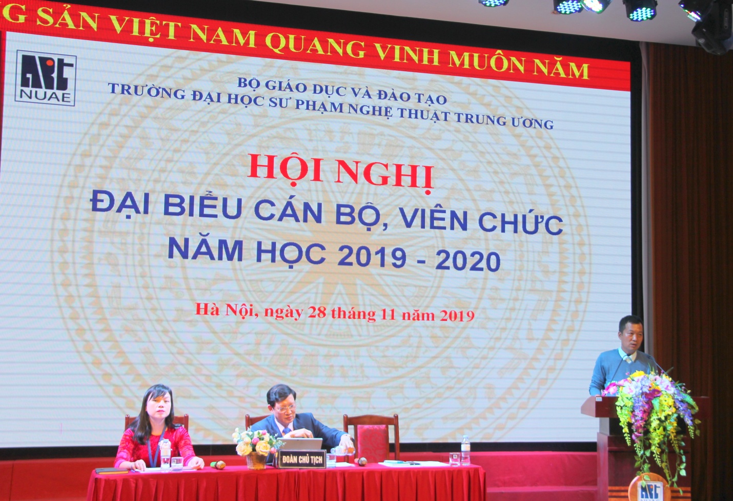 Cũng trong khuôn khổ của Hội nghị, đồng chí Đỗ Anh Tuấn – Chủ tịch Công đoàn Trường, Giám đốc Trung tâm Truyền thông và Ứng dụng nghệ thuật đã phát động phong trào thi đua thực hiện nhiệm vụ năm học 2019 – 2020. Bản báo cáo kêu gọi toàn thể cán bộ, viên chức trong toàn trường tiếp tục phát huy truyền thống đoàn kết, năng động, sáng tạo để hoàn thành tốt các nhiệm vụ được giao, chấp hành tốt quy định của Trường, đơn vị để tiếp tục xây dựng Trường Đại học Sư phạm Nghệ thuật TW phát triển vững mạnh trong những năm tiếp theo.