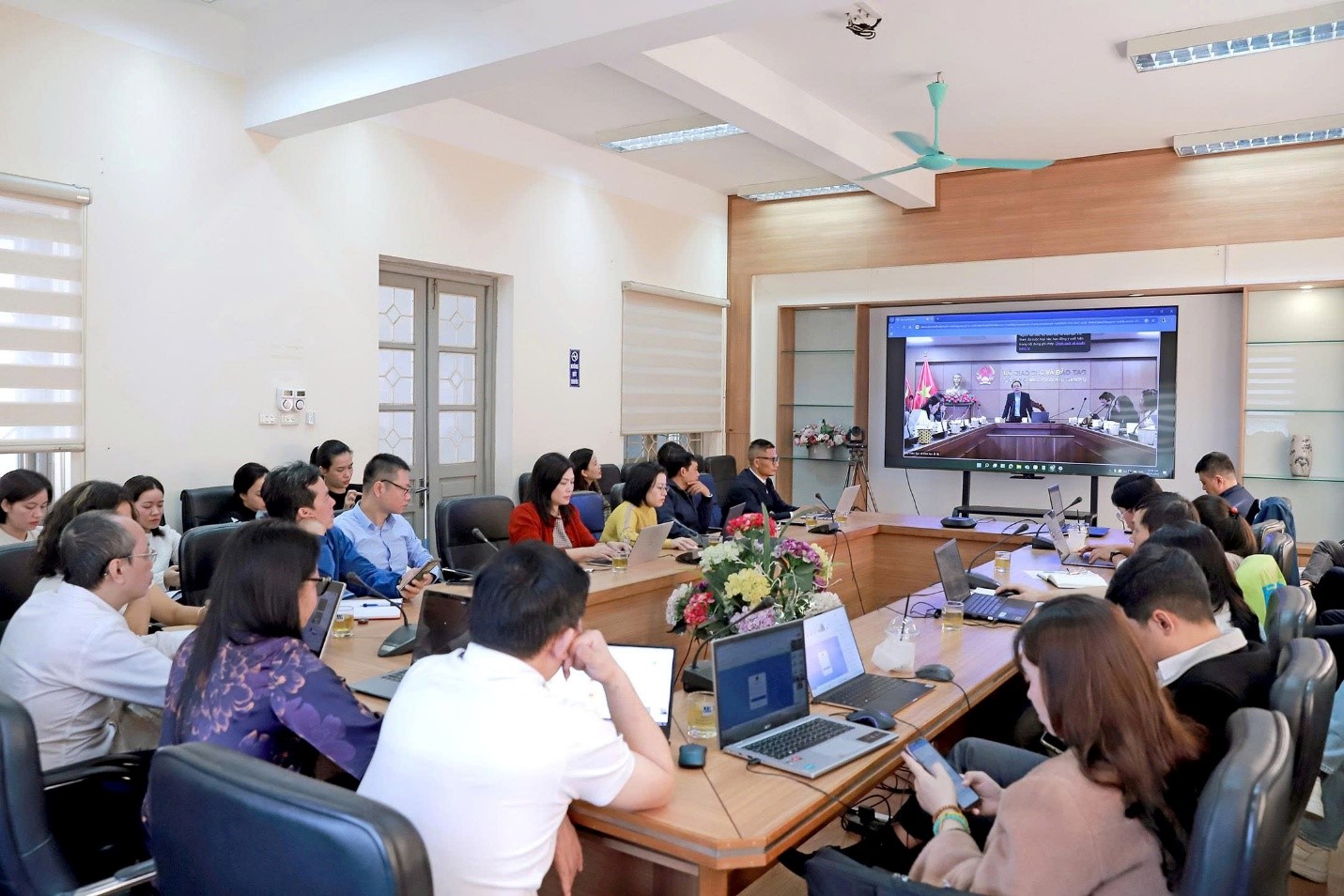 Toàn cảnh hội nghị trực tuyến với sự tham gia của các lãnh đạo và cán bộ NUAE
