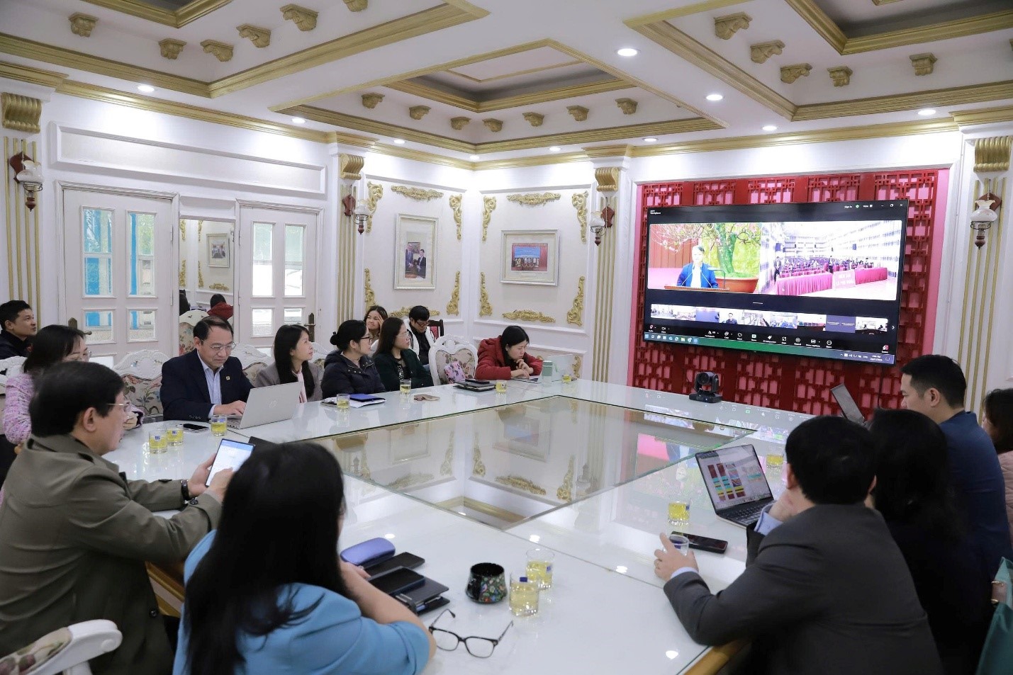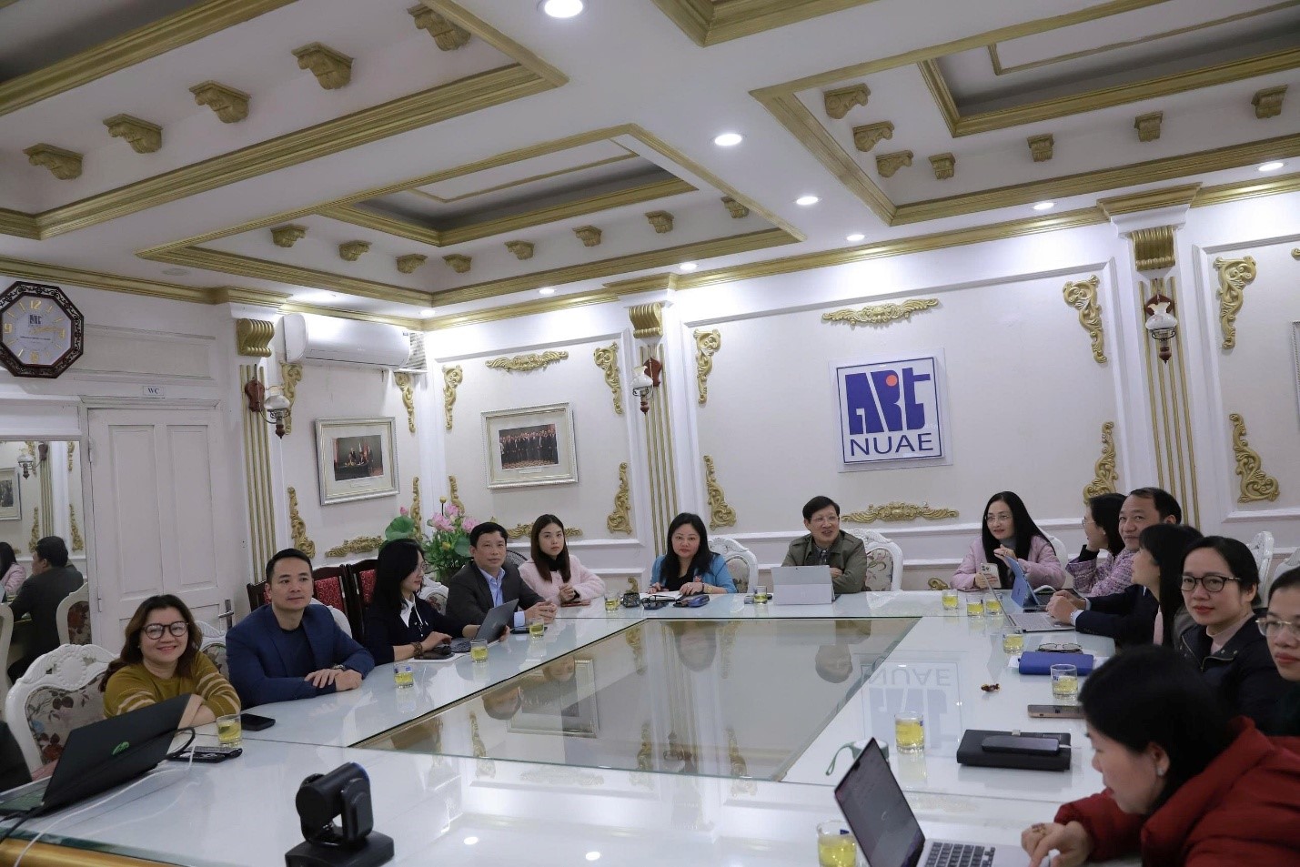 Toàn cảnh Hội nghị trực tuyến với sự tham gia của các lãnh đạo và cán bộ NUAE
