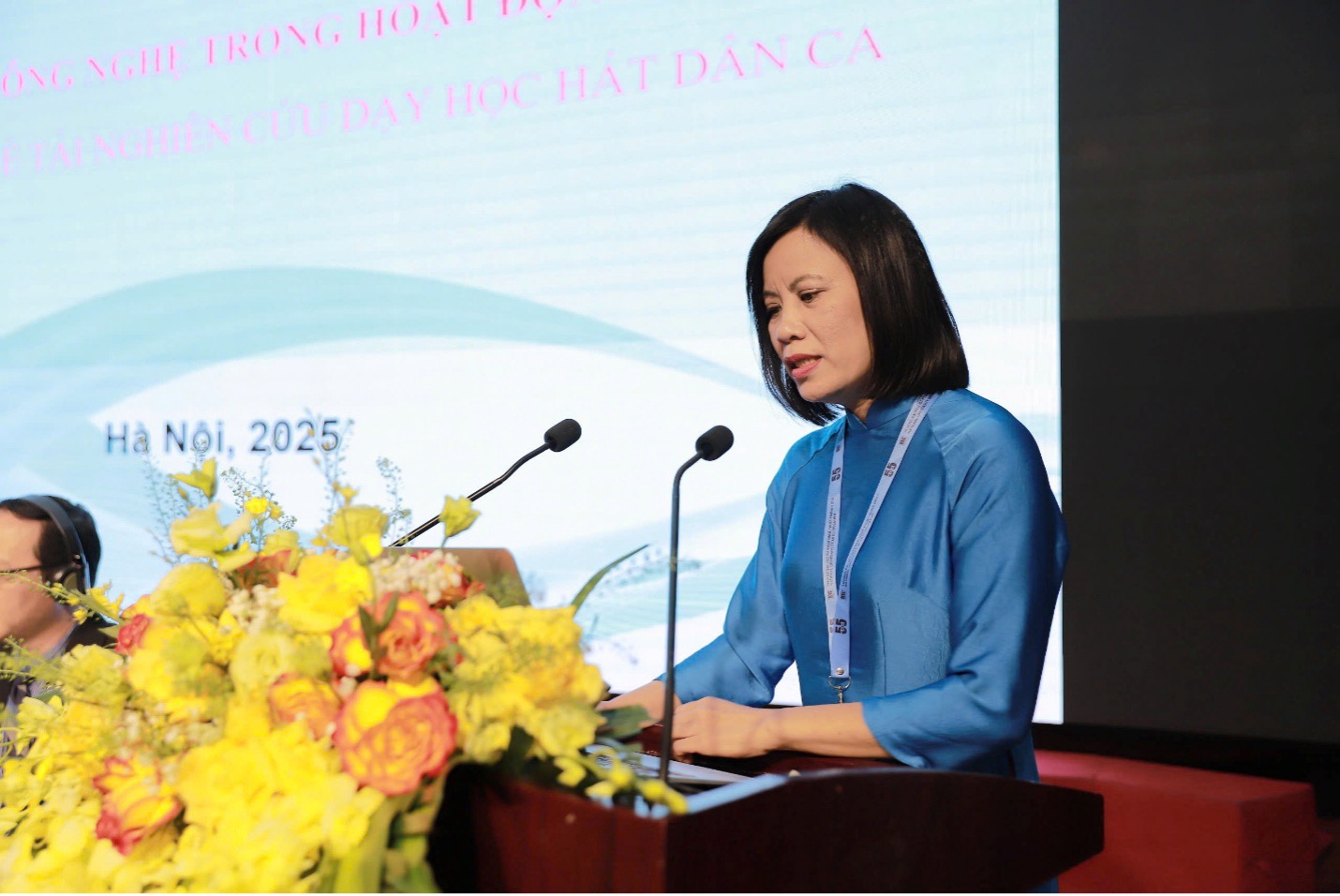 Tham luận “Ứng dụng công nghệ trong hoạt động điền dã thực hiện đề tài nghiên cứu dạy học dân ca” do TS. Đào Thị Thanh Nhàn – giảng viên Học viện Âm nhạc Quốc gia Việt Nam trình bày, nhấn mạnh vai trò quan trọng của công nghệ trong nghiên cứu và giảng dạy âm nhạc dân tộc. Bài tham luận phân tích thực trạng ứng dụng công nghệ trong hoạt động điền dã, chỉ ra lợi ích và những vấn đề đặt ra trong quá trình nghiên cứu và dạy học dân ca. Việc sử dụng công nghệ không thay thế phương pháp truyền thống nhưng góp phần mở rộng phạm vi, nâng cao hiệu quả và tính khách quan của nghiên cứu. Đồng thời, công nghệ tạo môi trường học tập tương tác, giúp người học trải nghiệm trực tiếp âm thanh, hình ảnh, qua đó phát huy giá trị âm nhạc dân tộc và nâng cao năng lực giảng dạy dân ca. Đây được xem là hướng tiếp cận thiết thực, hỗ trợ giáo viên trong nghiên cứu thực địa và góp phần bảo tồn, lan tỏa di sản văn hóa phi vật thể.