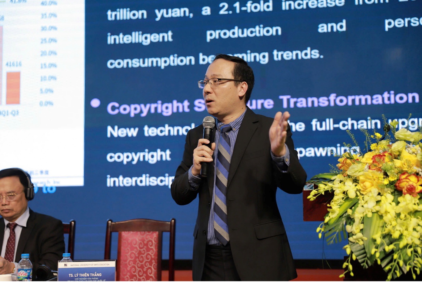 TS. Lý Thiên Thắng – Chủ nhiệm Văn phòng Trung tâm Giao lưu Giáo dục quốc tế, Học viện Nghệ thuật Quảng Tây trình bày tham luận “Xây dựng ma trận năng lực cho nhân tài ngành công nghiệp văn hóa và đổi mới trong con đường phát triển của họ trong kỷ nguyên AI”