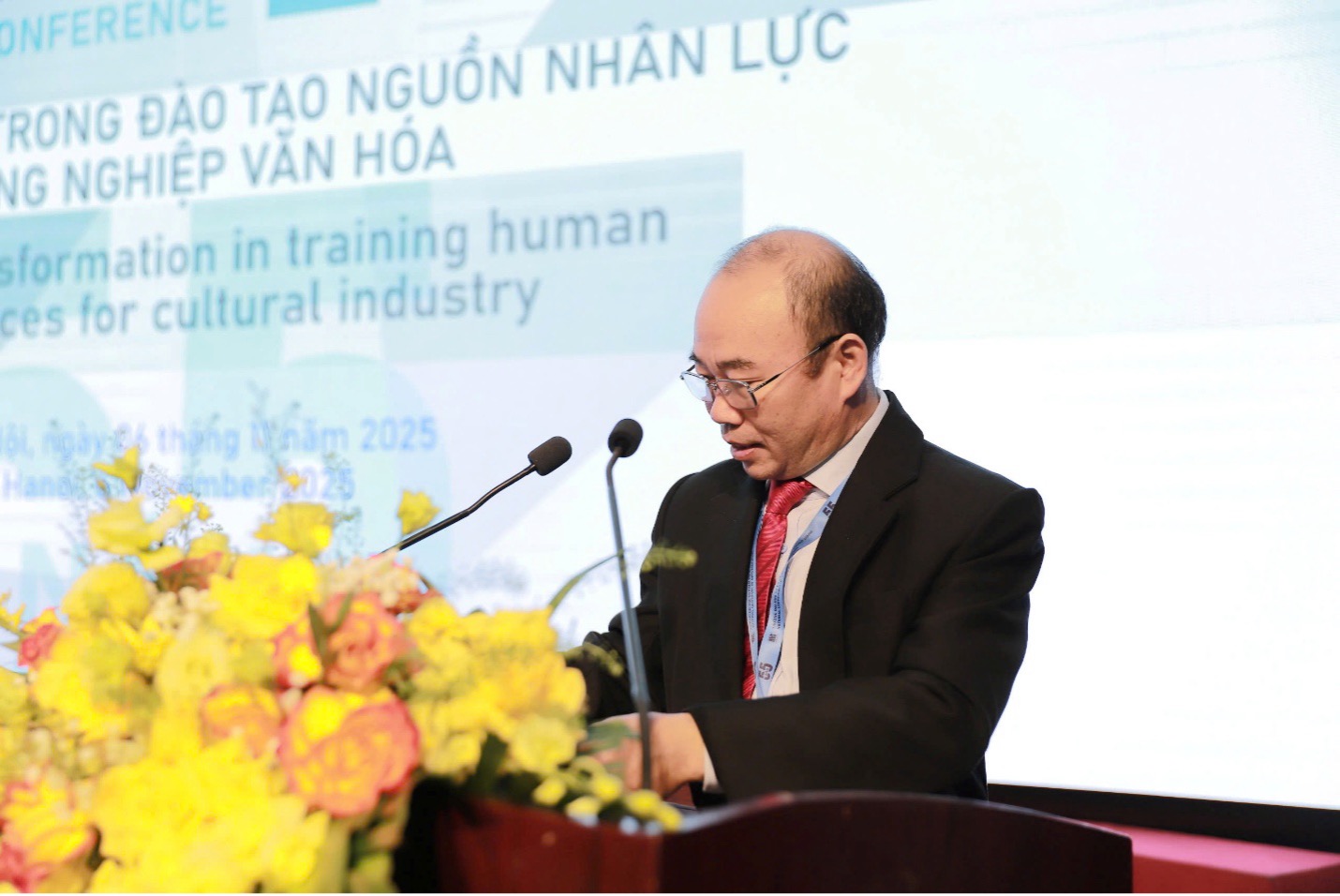 Phát biểu đề dẫn, PGS.TS. Lê Vinh Hưng cho rằng cuộc Cách mạng Công nghiệp 4.0 và làn sóng chuyển đổi số đang diễn ra mạnh mẽ trên toàn thế giới, tác động sâu sắc đến mọi lĩnh vực, đặc biệt là lĩnh vực Công nghiệp Văn hóa. Công nghệ số đã thay đổi triệt để mô hình sản xuất, phân phối và tiêu thụ sản phẩm văn hóa, đồng thời mở ra không gian sáng tạo vô tận với các loại hình mới như nghệ thuật số, thực tế ảo và nền tảng nội dung số. Sự chuyển dịch này đặt ra yêu cầu cấp thiết về đổi mới trong đào tạo để cung cấp nguồn nhân lực có đủ năng lực thích ứng và dẫn dắt sự phát triển của Công nghiệp Văn hóa trong kỷ nguyên số.