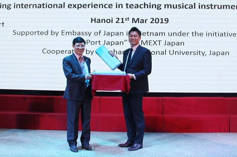Thay mặt cho công ty Yamaha, ông Makoto Tani – Tổng Giám đốc công ty Âm nhạc Yamaha Việt Nam lên trao tặng các thiết bị dạy học âm nhạc cho Trường ĐHSP Nghệ thuật TW là trường hàng đầu cả nước về đào tạo giáo viên nghệ thuật.