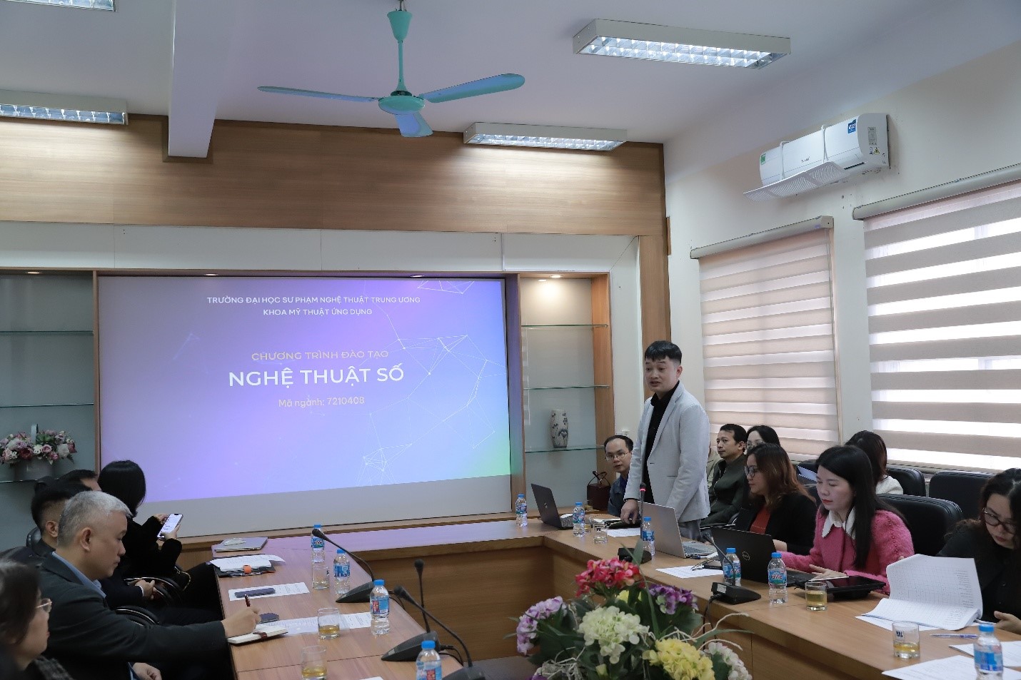 Đại diện Ban xây dựng chương trình, TS. Yến Văn Hòa – Giảng viên Khoa Mỹ thuật Ứng dụng đã trình bày báo cáo tổng quan về mục tiêu chương trình đào tạo ngành Nghệ thuật số của Trường ĐHSP Nghệ thuật TW. Báo cáo tập trung giới thiệu khái quát về ngành đào tạo, xu hướng phát triển của Nghệ thuật số, nội dung và cấu trúc chương trình đào tạo, định hướng vị trí việc làm sau tốt nghiệp cũng như điều kiện cơ sở vật chất phục vụ đào tạo, qua đó khẳng định chương trình nhằm trang bị cho sinh viên kiến thức, kỹ năng và năng lực sáng tạo cần thiết để thích ứng với môi trường làm việc trong lĩnh vực công nghiệp sáng tạo số.