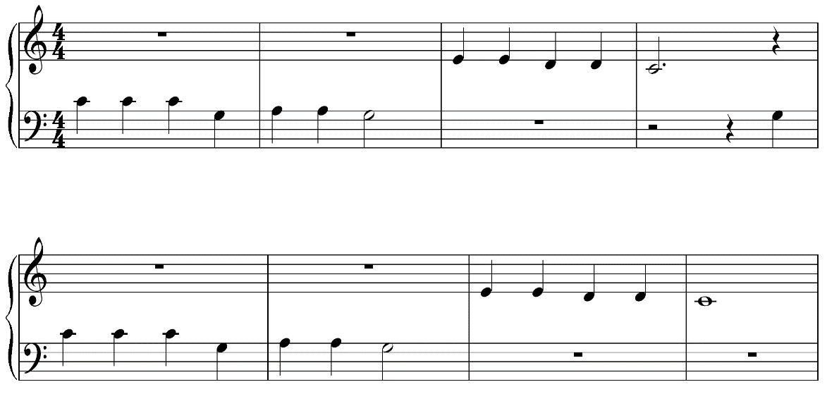 Bài Trang trại của bác Tôm, giai điệu đơn giản nhưng lại được luân chuyển giữa hai bè một cách có chu kỳ và cân đối: tiết nhạc thứ nhất, thứ ba ở bè dưới; tiết nhạc thứ hai, thứ tư ở bè trên. Khi học bài này, nên khuyến khích HS tự đọc, chỉ lưu ý với các em là đọc đúng trường độ của nốt nhạc, không cần quan tâm đến cao độ. Dưới đây lại là một trường hợp khác: