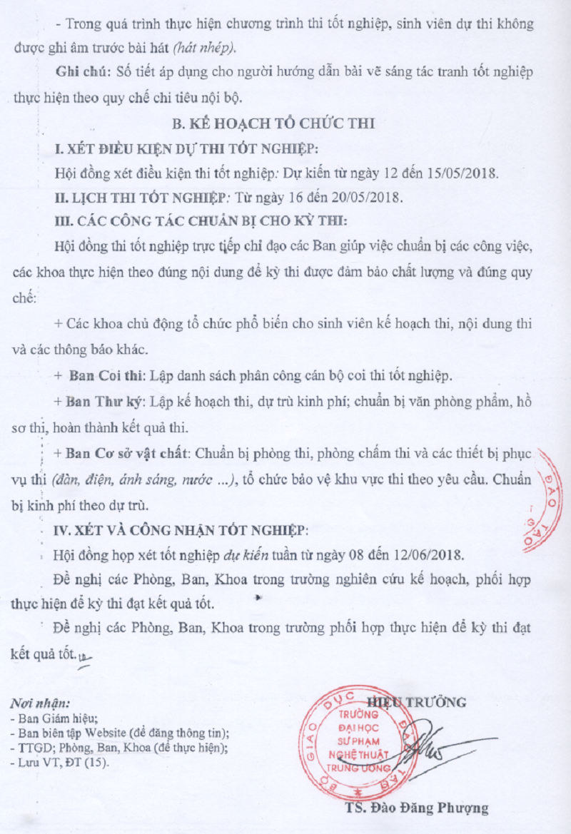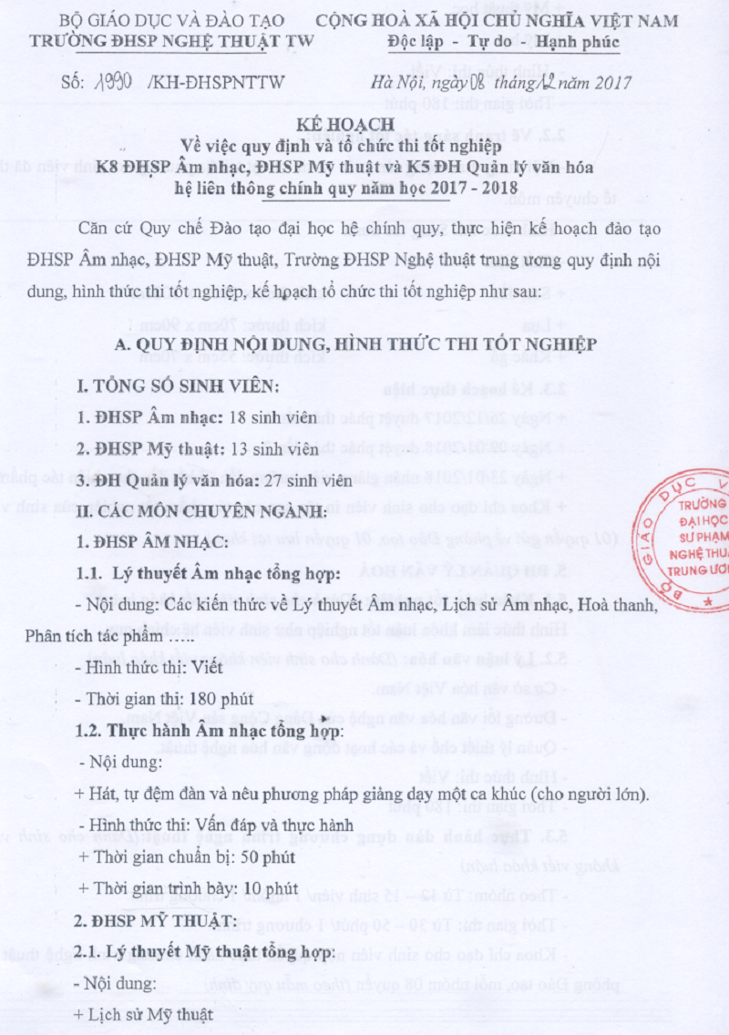 Kế hoạch quy định và tổ chức thi tốt nghiệp K8 ĐHSP Âm nhạc, Mỹ thuật và K5 ĐH Quản lý văn hóa hệ liên thông chính quy năm học 2017 – 2018