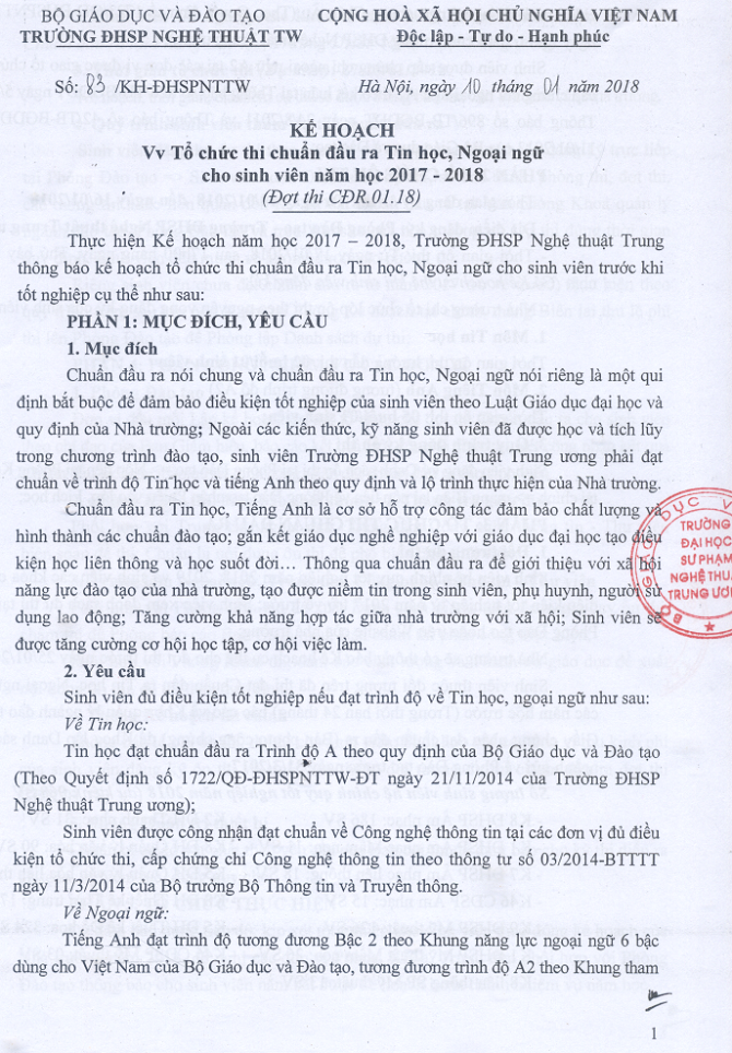 Kế hoạch tổ chức thi chuẩn đầu ra Tin học, Ngoại ngữ cho sinh viên năm học 2017 – 2018 (Đợt thi CDR.01.18)