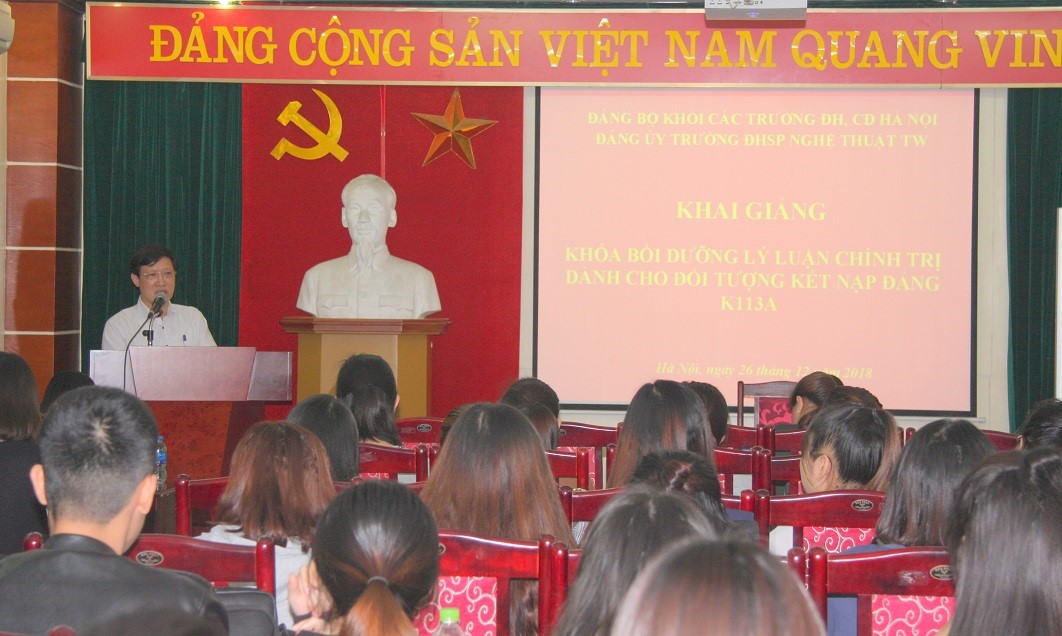 Phát biểu tại buổi lễ, PGS.TS. Đào Đăng Phượng – Bí thư Đảng ủy, Hiệụ trưởng Nhà trường nhấn mạnh, việc trường ĐHSP Nghệ thuật TW được Đảng ủy khối các trường Đại học, Cao đẳng Hà Nội cho phép mở lớp bồi dưỡng nhận thức về Đảng là niềm vinh dự và cũng là trách nhiệm to lớn của Nhà trường. Trong những năm qua, Nhà trường đã luôn chú trọng bồi dưỡng và giới thiệu các quần chúng ưu tú vào hàng ngũ của Đảng, thực hiện tốt công tác phát triển Đảng tại cơ sở. Đồng chí hi vọng, các học viên của Lớp bồi dưỡng nhận thức về Đảng do Nhà trường tổ chức sẽ nêu cao ý thức, tinh thần học tập, tham gia đầy đủ các buổi học và hoàn thành lớp học với kết quả tốt, rèn luyện bản lĩnh chính trị vững vàng, phẩm chất đạo đức trong sáng để sớm trở thành đảng viên Đảng Cộng sản Việt Nam.