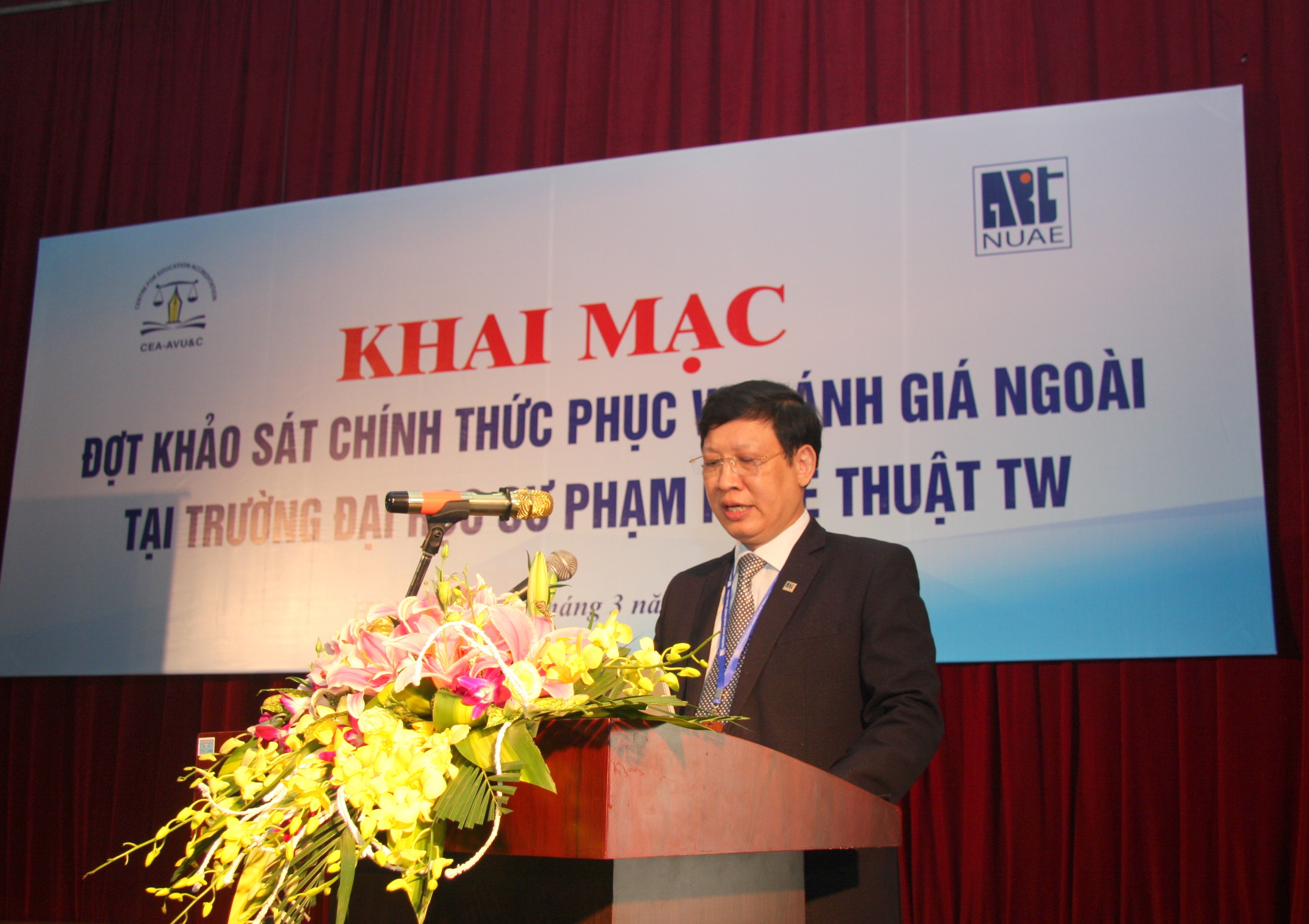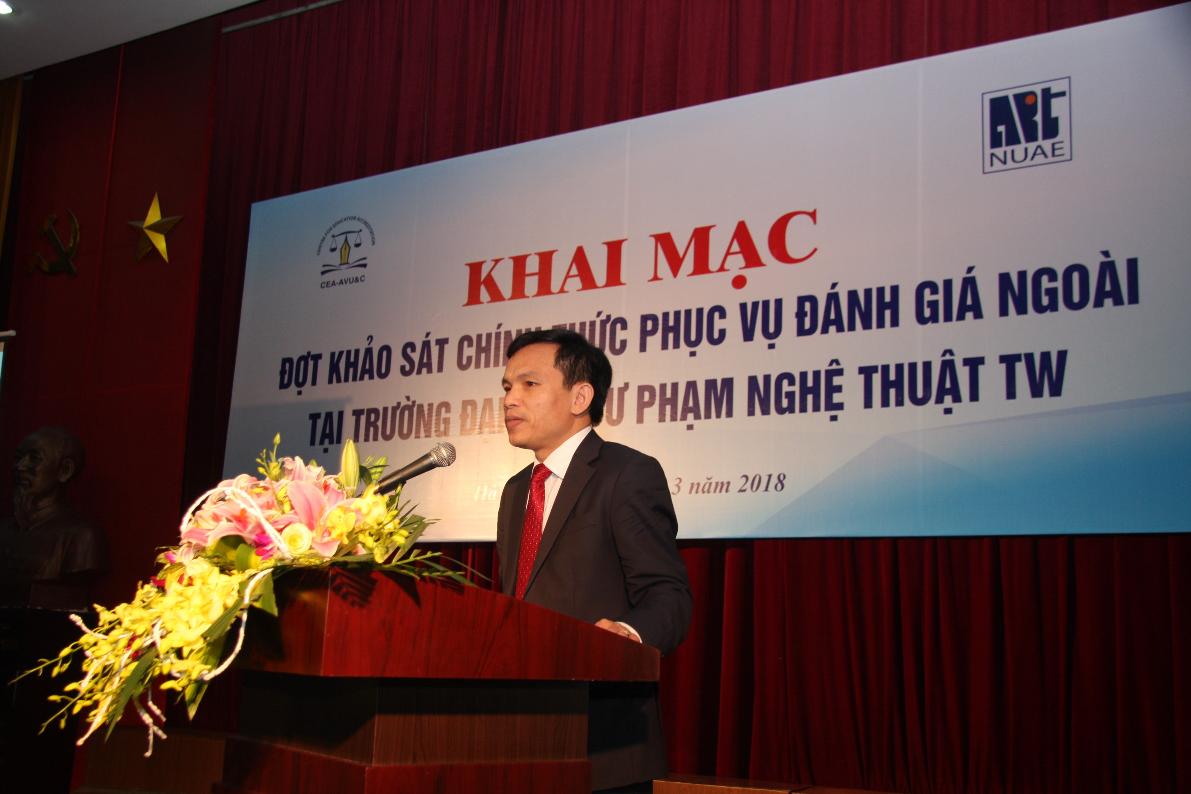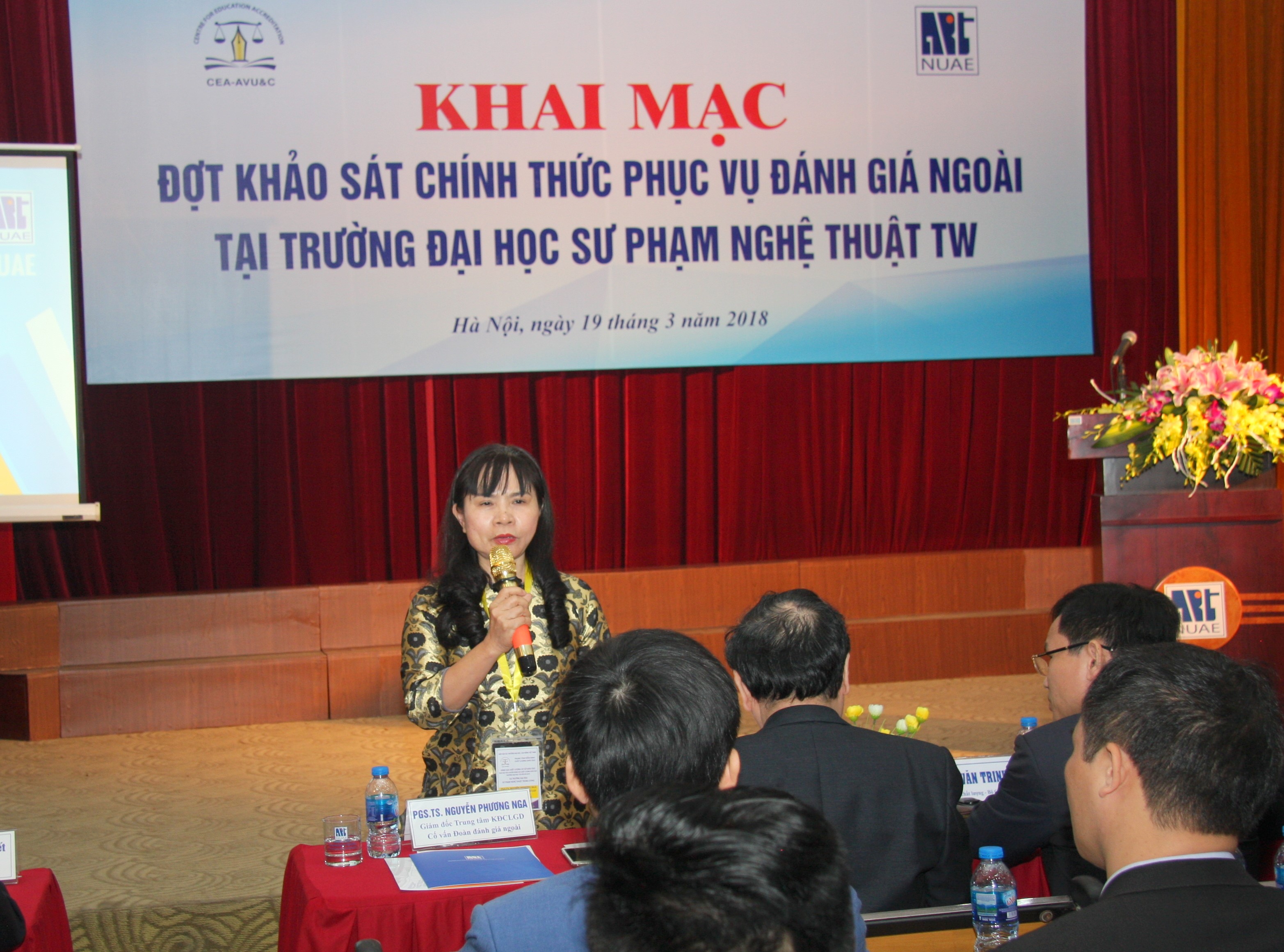 Phát biểu tại lễ Khai mạc, PGS.TS. Nguyễn Phương Nga, Giám đốc Trung tâm Kiểm định chất lượng giáo dục, Cố vấn đoàn Đánh giá ngoài khẳng định tầm quan trọng của việc đánh giá ngoài; khẳng định mục đích chính của kiểm định chất lượng giáo dục là nhằm đảm bảo đạt được những chuẩn mực nhất định trong đào tạo và không ngừng cải tiến, nâng cao chất lượng đào tạo, đáp ứng yêu cầu của người sử dụng nguồn nhân lực và đảm bảo quyền lợi cho người học. Giám đốc cũng đánh giá cao sự phối hợp chặt chẽ của Trường ĐHSP Nghệ thuật TW với Trung tâm Kiểm định Chất lượng giáo dục (Hiệp hội các trường đại học, cao đẳng Việt Nam) trong quá trình chuẩn bị cho đợt khảo sát chính thức và đề nghị Trường tiếp tục hỗ trợ Đoàn chuyên gia đánh giá ngoài trong quá trình triển khai các hoạt động kiểm định chất lượng giáo dục.