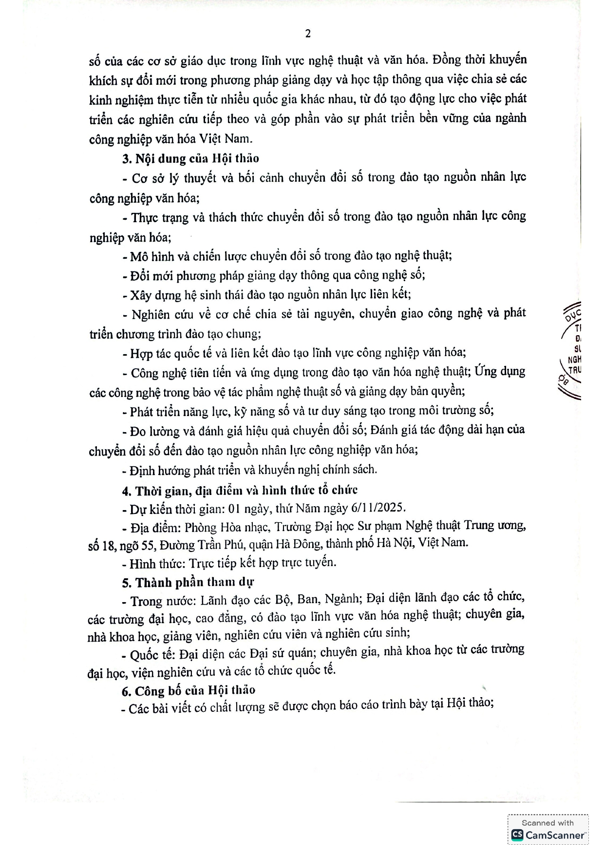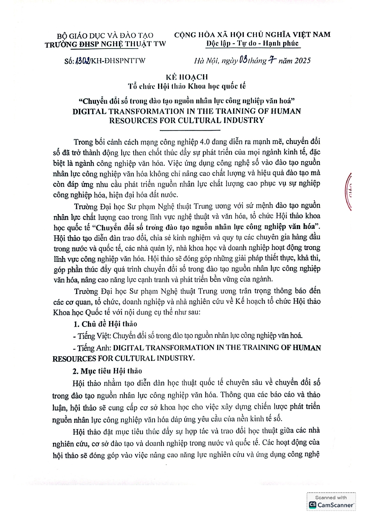 Kế hoạch tổ chức Hội thảo khoa học Quốc tế. Chuyển đổi số trong đào tạo nguồn nhân lực công nghiệp văn hoá (DIGITAL TRANSFORMATION IN CULTURAL INDUSTRY HUMAN RESOURCE TRAINING)
