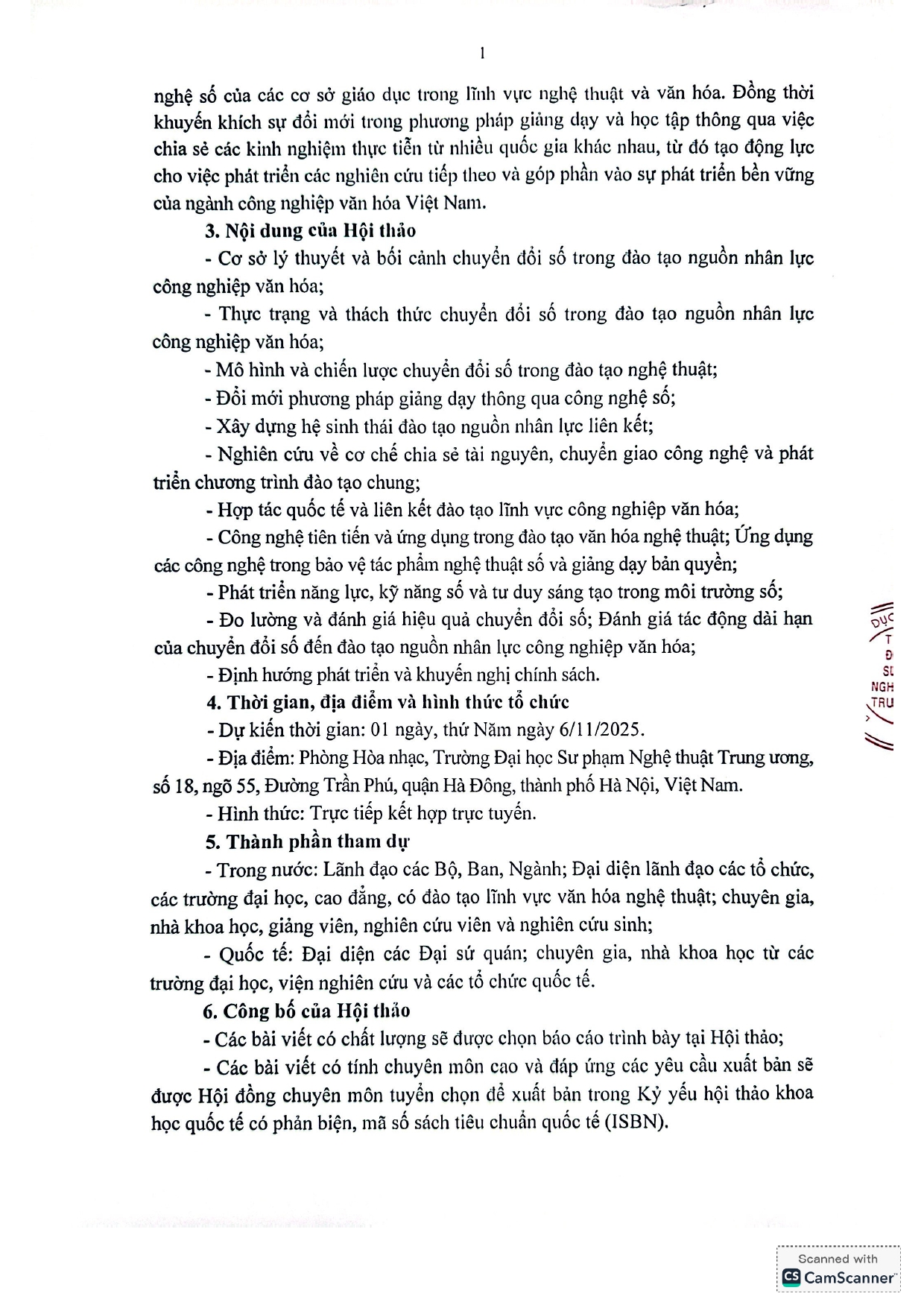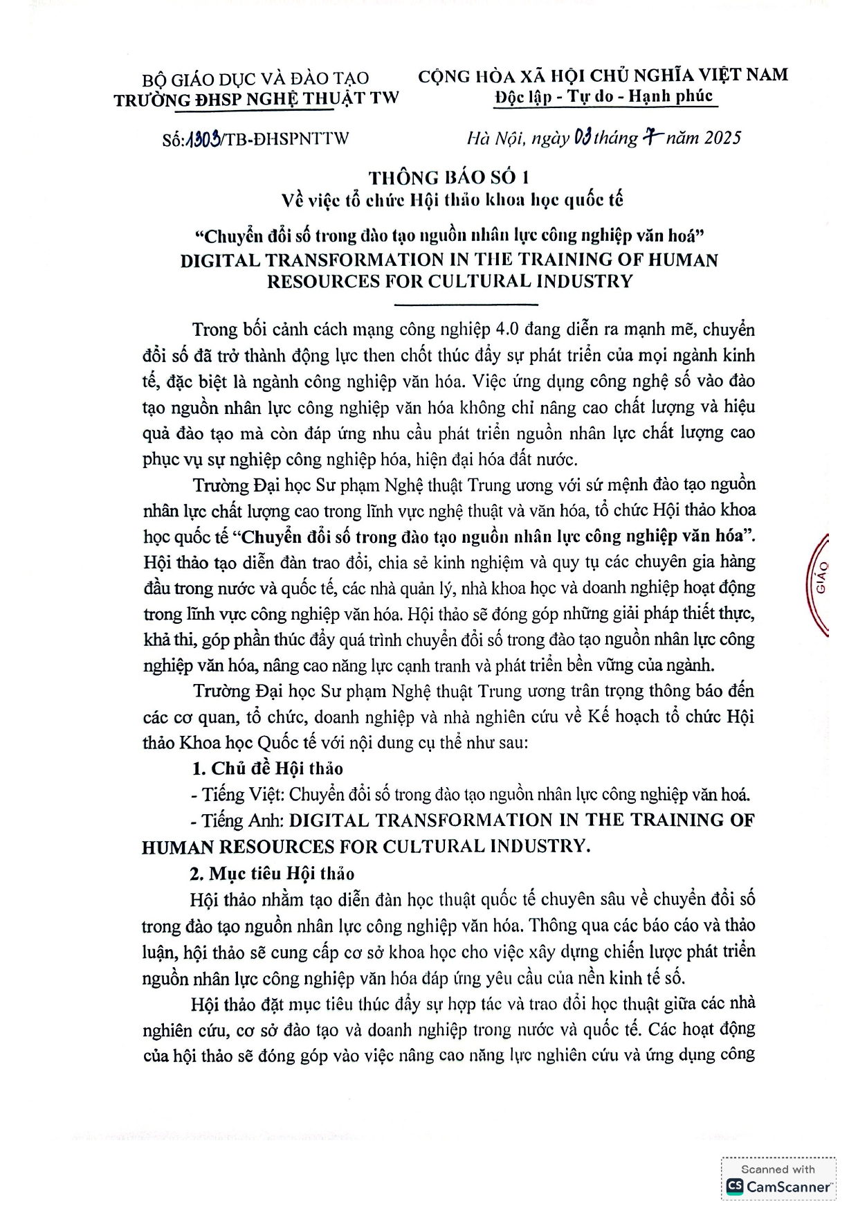 Thông báo số 1 V/v Tổ chức Hội thảo Khoa học Quốc tế. Chuyển đổi số trong đào tạo nguồn nhân lực công nghiệp văn hoá (DIGITAL TRANSFORMATION IN CULTURAL INDUSTRY HUMAN RESOURCE TRAINING)