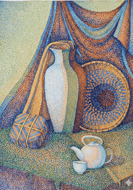 Họa sĩ Georges Seurat, người đưa Toán học vào bảng màu: Ông không nhìn hội họa qua những cảm xúc nhất thời mà nhìn nó qua lăng kính của vật lý quang học. sáng tác theo quan điểm dựa trên việc đặt những chấm màu nguyên chất cạnh nhau để mắt người tự pha trộn chúng ở một khoảng cách nhất định. Dường như những tác phẩm của Seurat không mờ ảo như phái Ấn tượng; chúng vững chãi, có cấu trúc và mang tính hình học lý tưởng. Mọi vật chất trong không gian đều có một hình thù nhất định và thông qua hình thù và màu sắc đó, ta có thể biết được nó thuộc thể chất gì. Chất rắn hay chất lỏng, chất thô hay chất mịn. Khi ta so sánh các vật thể xung quanh như cái bàn gỗ đặt cạnh cái tủ kính thì tự thân nó dựa vào tính vốn có của sự vật đã có sự khác nhau, mặt nước hồ trong xanh soi bóng những hàng liễu bên hồ, nước hồ lăn tăn. Gỗ, nước, mây đều là các chất khác nhau chất rắn, chất lỏng, chất khí. Mỗi chất đó được chúng ta cảm nhận thông qua thị giác, sự tinh tế của con mắt có thể phát hiện rất nhiều trạng thái vật chất khác nhau, cho ta những thông tin chính xác về các loại chất của sự vật, đặc điểm bề mặt, các trạng thái của nó, cũng như phân biệt vật này với vật khác [1]. Seurat không chỉ là một danh họa, ông còn tự coi mình là một “nhà khoa học nghệ thuật” và tin rằng một họa sĩ có thể sử dụng các quy luật về màu sắc và đường nét để tạo ra cảm giác vui vẻ, buồn bã hoặc yên bình một cách có tính toán, giống như cách một nhạc sĩ sử dụng các nốt nhạc. Chính vì vậy, ông đã sử dụng quy luật quang học của ánh sáng và màu sắc trong tác phẩm của mình trở thành những yếu tố cơ bản nhất. Sự chiếm lĩnh không gian và bề mặt tranh là những ấn tượng về màu, về mảng hình học đôi khi được họa sĩ giản lược.