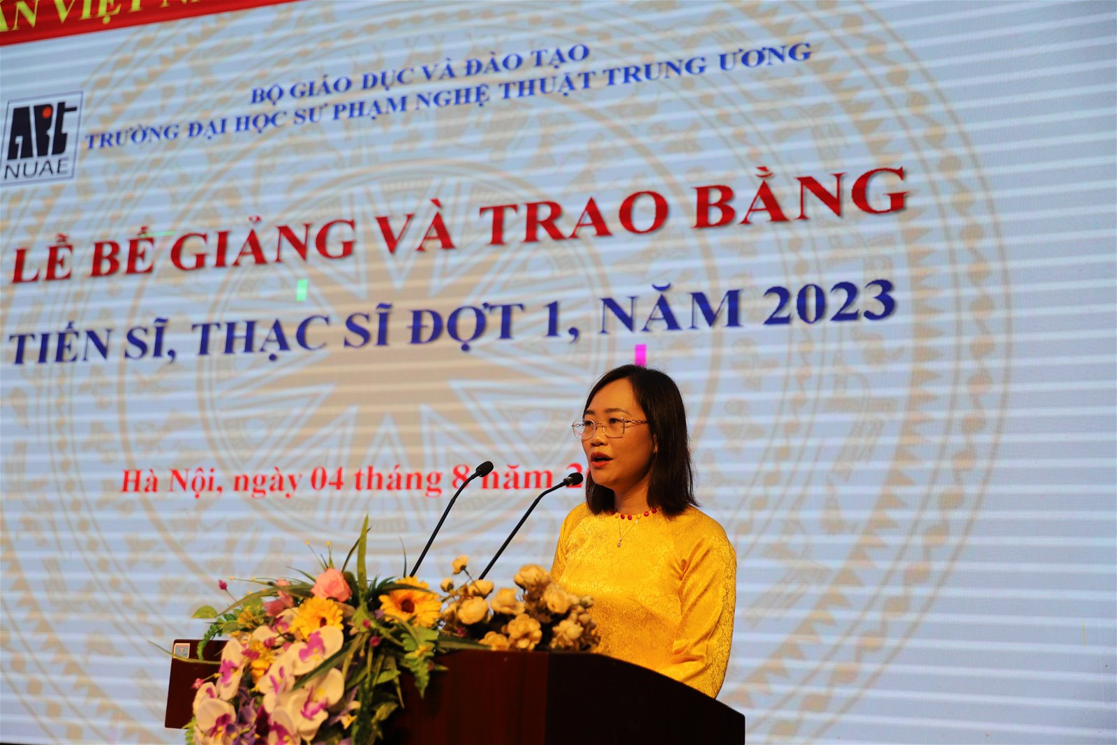 Phát biểu tại buổi lễ, thay mặt Đảng ủy, Ban Giám hiệu Nhà trường, PGS.TS.NGƯT. Đào Đăng Phượng – Hiệu trưởng Nhà trường đã nhiệt liệt chúc mừng thành công của các tân Tiến sĩ, tân Thạc sĩ; đồng thời khẳng định đây không chỉ là niềm vinh dự cho bản thân, gia đình, cơ quan công tác và cả Nhà trường ĐHSP Nghệ thuật TW. PGS.TS. Đào Đăng Phượng đã ghi nhận, động viên đến toàn thể cán bộ, giảng viên và các nghiên cứu sinh, học viên đã luôn đồng hành, chia sẻ cùng Nhà trường vượt qua những khó khăn thử thách, đặc biệt trong bối cảnh toàn xã hội và nền giáo dục nước nhà phải đối mặt với đại dịch Covid -19 vừa qua, để có được kết quả đáng tự hào như hôm nay.