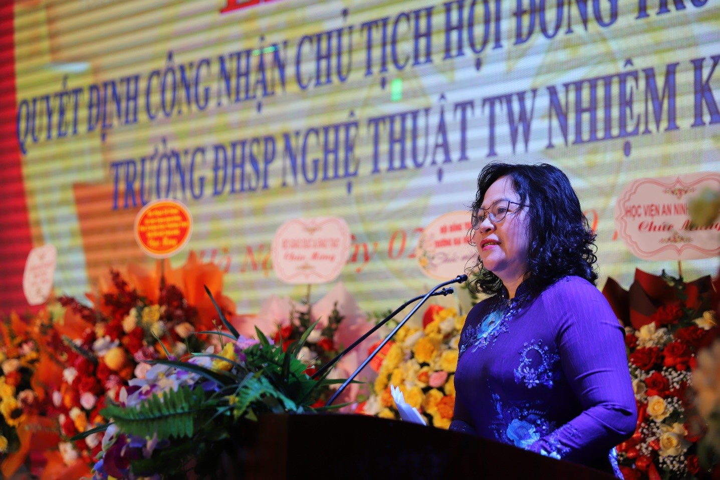 Tại buổi lễ, đồng chí Ngô Thị Minh – Ủy viên Ban Cán sự Đảng, Thứ trưởng Bộ Giáo dục và Đào tạo đã phát biểu chúc mừng và trao quyết định của Bộ Trưởng Bộ Giáo dục và Đào tạo về việc bổ nhiệm chức vụ Chủ tịch Hội Đồng Trường ĐHSP Nghệ thuật TW nhiệm kỳ 2020-2025 cho PGS.TS.NGƯT. Đào Đăng Phượng.