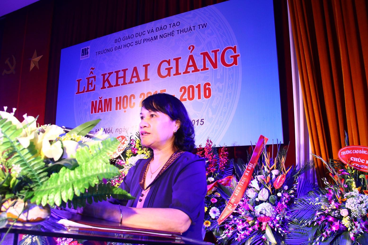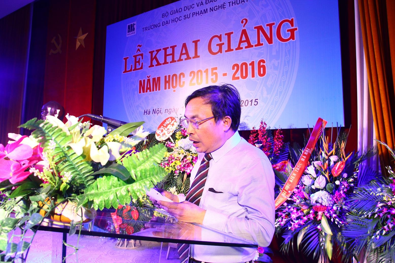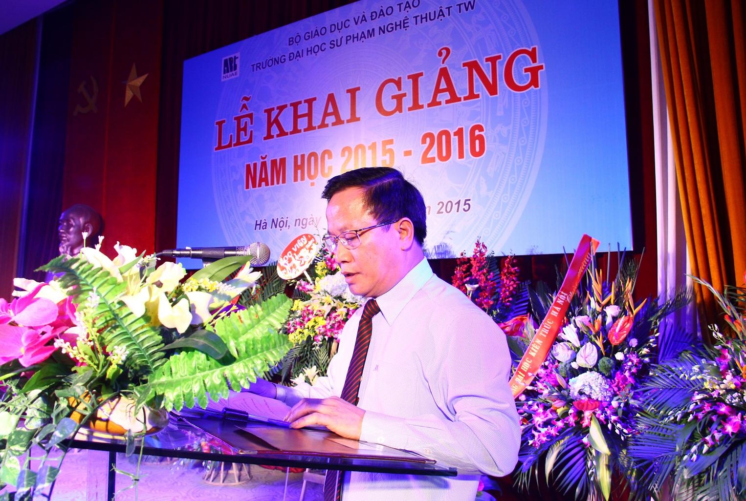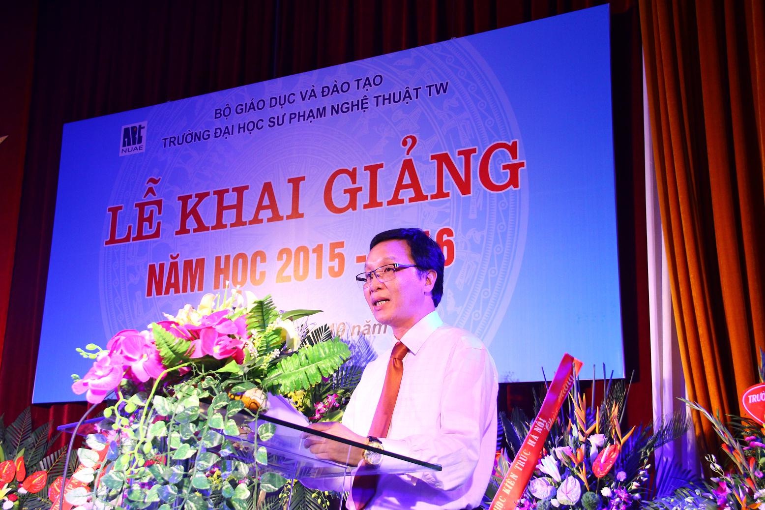 Thay mặt Ban tổ chức Lễ khai giảng, TS. Trần Đình Tuấn, Đảng ủy viên, Phó Hiệu trưởng chúc mừng 985 tân sinh viên đã xuất sắc vượt qua kỳ thi đại học năm 2015 và chính thức bước vào năm học đầu tiên tại Trường ĐHSP Nghệ thuật TW. TS. Trần Đình Tuấn đã điểm lại những thành tích tốt đẹp mà tập thể Nhà trường đã đạt được trong năm học vừa qua. Năm 2014 là năm đầu tiên Tạp chí Giáo dục Nghệ thuật của Trường được Hội đồng Chức danh Giáo sư Nhà nước xếp vào danh mục các tạp chí được tính điểm quy đổi công trình khoa học; 02 cán bộ, giảng viên được phong tặng danh hiệu Nhà giáo ưu tú, có 03 cá nhân đạt danh hiệu “Người tốt việc tốt” của Thành phố Hà Nội; 01 đồng chí được tặng danh hiệu “Chiến sĩ thi đua toàn quốc”; Tiếp nối những thành công đó, ngày 30/01/2015, Trường được Bộ Giáo dục và Đào tạo cho phép đào tạo chuyên ngành Lý luận và Phương pháp dạy học Âm nhạc trình độ Tiến sĩ theo Quyết định số 317/BGD&ĐT; ngày 04/02/2015, Trường vinh dự có 06 cán bộ, giảng viên được xét phong các chức danh Giáo sư và Phó giáo sư; Tháng 8/2015, Nhà trường tiếp tục được Bộ Giáo dục và Đào tạo cho phép đào tạo thêm 03 ngành, chuyên ngành mới: chuyên ngành Lý luận và Phương pháp dạy học Mỹ thuật trình độ Thạc sĩ, Đại học Piano và Đại học diễn viên sân khấu Kịch – Điện ảnh. Có được những thành công đó là nhờ sự quan tâm, chỉ đạo kịp thời của các cấp lãnh đạo cùng với tinh thần đoàn kết, sáng tạo của  tập thể cán bộ, giảng viên và sinh viên Trường ĐHSP Nghệ thuật TW. TS. Trần Đình Tuấn cũng mong rằng: tập thể cán bộ, giảng viên và sinh viên Nhà trường cần phát huy tốt những thành quả đã đạt được trong năm học vừa qua và tiếp tục nỗ lực, quyết tâm hơn nữa để hoàn thành tốt nhiệm vụ chính trị mà Đảng – Nhà nước và nhân dân giao phó, góp phần vào việc nâng cao trình độ dân trí, đào tạo nguồn nhân lực cho đất nước.