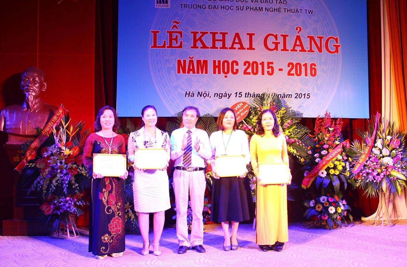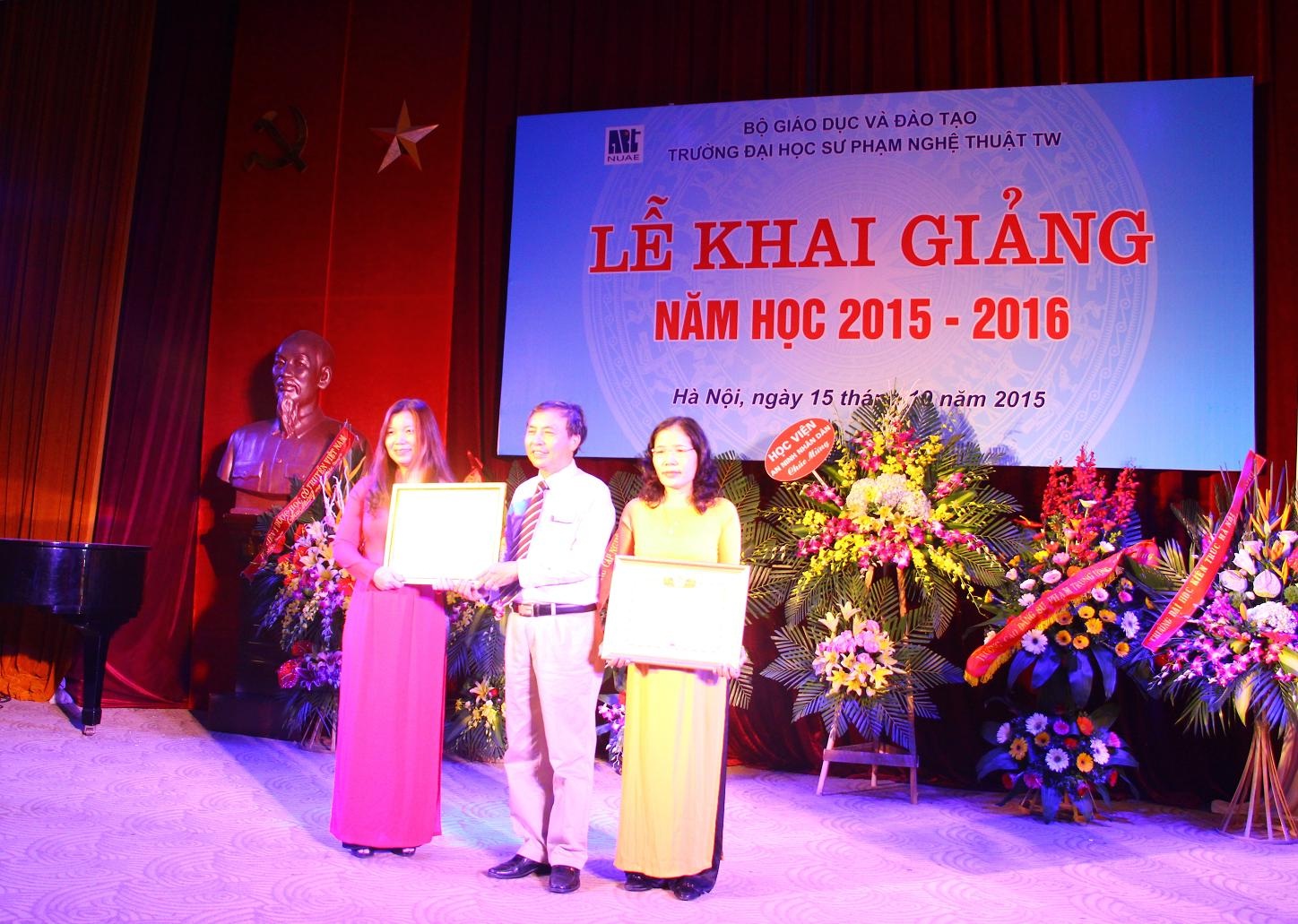 TS. Phạm Văn Thanh – Phó Chủ tịch Công đoàn Giáo dục Việt Nam trao Bằng khen của BCH Công đoàn GDVN cho ThS. Nguyễn Thị Hồng Thư – Phó Chủ tịch Công đoàn Trường, Phó Trưởng khoa MTCS; ThS. Trần Thị Thảo – Ủy viên BCH Công đoàn – Phó Trưởng khoa Thanh Nhạc