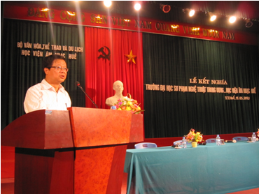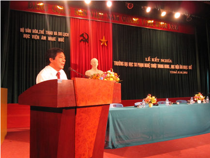 Mở đầu buổi lễ, TS. Nguyễn Việt Đức – Giám đốc học viện Âm nhạc Huế đã bày tỏ niềm vui, lời cảm ơn sâu sắc của toàn thể lãnh đạo, cán bộ giảng viên và sinh viên của học viện đối sự quan tâm từ phía các cấp lãnh đạo Trung ương và địa phương Tỉnh Thừa Thiên Huế và đặc biệt là đoàn đại biểu Trường ĐHSP Nghệ thuật TW – khách mời, đối tác quan trọng đã tới thăm, tham gia đàm phán, ký kết thỏa thuận hợp tác. Trong bài phát biểu của mình, TS. Nguyễn Việt Đức đã báo cáo khái quát về đặc điểm, tình hình hoạt động của Học viện Âm nhạc Huế. Tiền thân là Trường Đại học Nghệ thuật Huế trực thuộc Đại học Huế, đặt dưới sự quản lý của Bộ Giáo dục và Đào tạo, tháng 11 năm 2007, Thủ tướng Chính phủ đã có quyết định thành lập Học viiện Âm nhạc Huế trực thuộc Bộ Văn hóa, Thể thao và Du lịch. Học viện Âm nhạc Huế có chức năng nghiên cứu, bảo tồn và phát huy các giá trị âm nhạc truyền thống, đặc biệt là các di sản Âm nhạc được UNESCO công nhận như: Nhã nhạc Huế, Không gian văn hóa Cồng chiêng Tây Nguyên… đào tạo, bồi dưỡng nguồn nhân lực về lĩnh vực Âm nhạc ở bậc trung học, đại học và sau đại học; nghiên cứu khoa học, biểu diễn Âm nhạc, góp phần giữ gìn và phát triển nền Âm nhạc Việt Nam mà trực tiếp là khu vực miền Trung và Tây Nguyên. Trước đòi hỏi của thực tiễn xã hội và của nền giáo dục nghệ thuật nước nhà, Học viện Âm nhạc Huế luôn nỗ lực, tích cực tìm ra hướng phát triển đúng đắn cho hoạt động của mình, trong đó có việc mở rộng liên kết đào tạo, nghiên cứu khoa học với nhiều học viện, trường đại học và các cơ sở đào tạo khác trong cả nước.