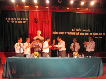 Ngày 11/5/2013, tại Thành phố Huế đã diễn ra Lễ ký kết thỏa thuận hợp tác giữa Học viện Âm nhạc Huế với Trường ĐHSP Nghệ thuật TW. Tham dự và chứng kiến Lễ ký kết có PGS.TS Đào Mạnh Hùng – Vụ trưởng Vụ Đào tạo, Bộ Văn hóa Thể thao và Du lịch, Đồng chí Phan Trọng Vinh – Phó Bí thư Tỉnh ủy, Chủ tịch UBND Tỉnh Thừa Thiên Huế, Đồng chí Phan Công Tuyên – Ủy viên thường vụ Tỉnh ủy, Trưởng ban Tuyên giáo Tỉnh; Đoàn đại biểu Trường ĐHSP Nghệ thuật TW do PGS.TSKH Phạm Lê Hòa – Bí thư Đảng ủy, Hiệu trưởng làm trưởng đoàn. Về phía Học viện Âm nhạc Huế có TS. Nguyễn Việt Đức – Giám đốc học viện, đại diện lãnh đạo các đơn vị và đông đảo cán bộ, giảng viên, sinh viên. Lễ ký kết cũng thu hút sự quan tâm của nhiều cơ quan báo chí, truyền hình Trung ương và địa phương tới tham đự.