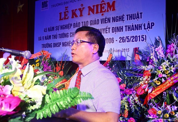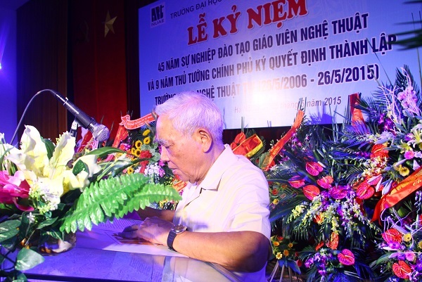 Mở đầu Lễ kỷ niệm, GS.TSKH, NGƯT Phạm Lê Hòa, Bí thư Đảng ủy, Hiệu trưởng Nhà trường đã xúc động ôn lại những dấu mốc lịch sử quan trọng của chặng đường 45 năm sự nghiệp đào tạo giáo viên nghệ thuật và 09 năm xây dựng và phát triển Trường ĐHSP Nghệ thuật TW. Từ những năm đầu thành lập Trường chỉ có rất ít cán bộ, giảng viên, đến nay Nhà trường đã có gần 400 cán bộ, giảng viên hầu hết đều ở trình độ Sau đại học. Hiệu trưởng cũng bày tỏ niềm tự hào khi điểm lại những dấu ấn đặc biệt trên các lĩnh vực công tác của Nhà trường trong thời gian vừa qua như: Tạp chí Giáo dục Nghệ thuật – tạp chí khoa học chuyên ngành được Hội đồng Chức danh Giáo sư Nhà nước xếp vào danh mục các tạp chí tính điểm công trình khoa học; thành lập Hội đồng Chức danh Giáo sư cơ sở; 02 nhà giáo được phong tặng danh hiệu Nhà giáo ưu tú; 06 nhà giáo, nhà khoa học là cán bộ, giảng viên của Trường được công nhận chức danh Giáo sư, Phó giáo sư; đặc biệt, ngày 30/01/2015, Bộ Giáo dục và Đào tạo đã có quyết định giao nhiệm vụ cho Nhà trường đào tạo chuyên ngành Lý luận và Phương pháp dạy học Âm nhạc trình độ Tiến sĩ…. Mặt khác, GS.TSKH, NGƯT Phạm Lê Hòa cũng nhấn mạnh đến thành quả mà Nhà trường đạt được cho tới ngày hôm nay chính là nhờ có một nền tảng vững chắc mà các thế hệ đi trước đã dày công tạo dựng và sự nỗ lực, đoàn kết của tập thể các cán bộ giảng viên, sinh viên Nhà trường.