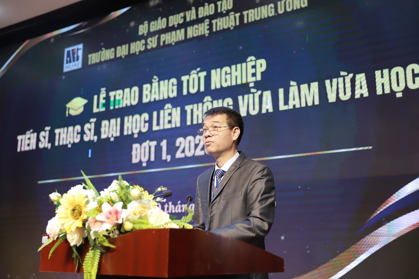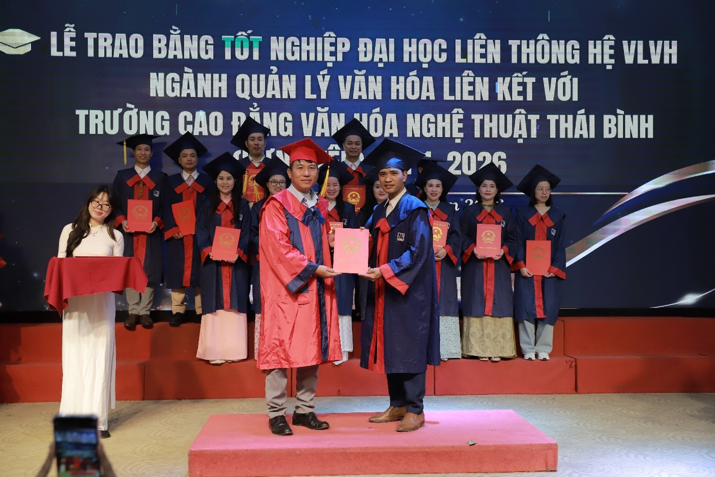 Nhân dịp này, Hiệu trưởng Nhà trường trân trọng ghi nhận và đánh giá cao kết quả hợp tác trong công tác liên kết đào tạo giữa Trường ĐHSP Nghệ thuật TW và Trường Cao đẳng Văn hóa Nghệ thuật Thái Bình, đặc biệt là những kết quả trong việc đào tạo và bồi dưỡng đối với 20 sinh viên đại học liên thông VLVH ngành Quản lý Văn hóa đã vinh dự được nhận bằng tốt nghiệp tại lễ trao bằng hôm nay. Thầy tin tưởng rằng, trên nền tảng mối quan hệ hợp tác tốt đẹp, bền vững được xây dựng qua nhiều năm, hai đơn vị sẽ tiếp tục tăng cường, mở rộng hợp tác trong thời gian tới, góp phần nâng cao chất lượng đào tạo và phát triển nguồn nhân lực văn hóa – nghệ thuật cho đất nước.