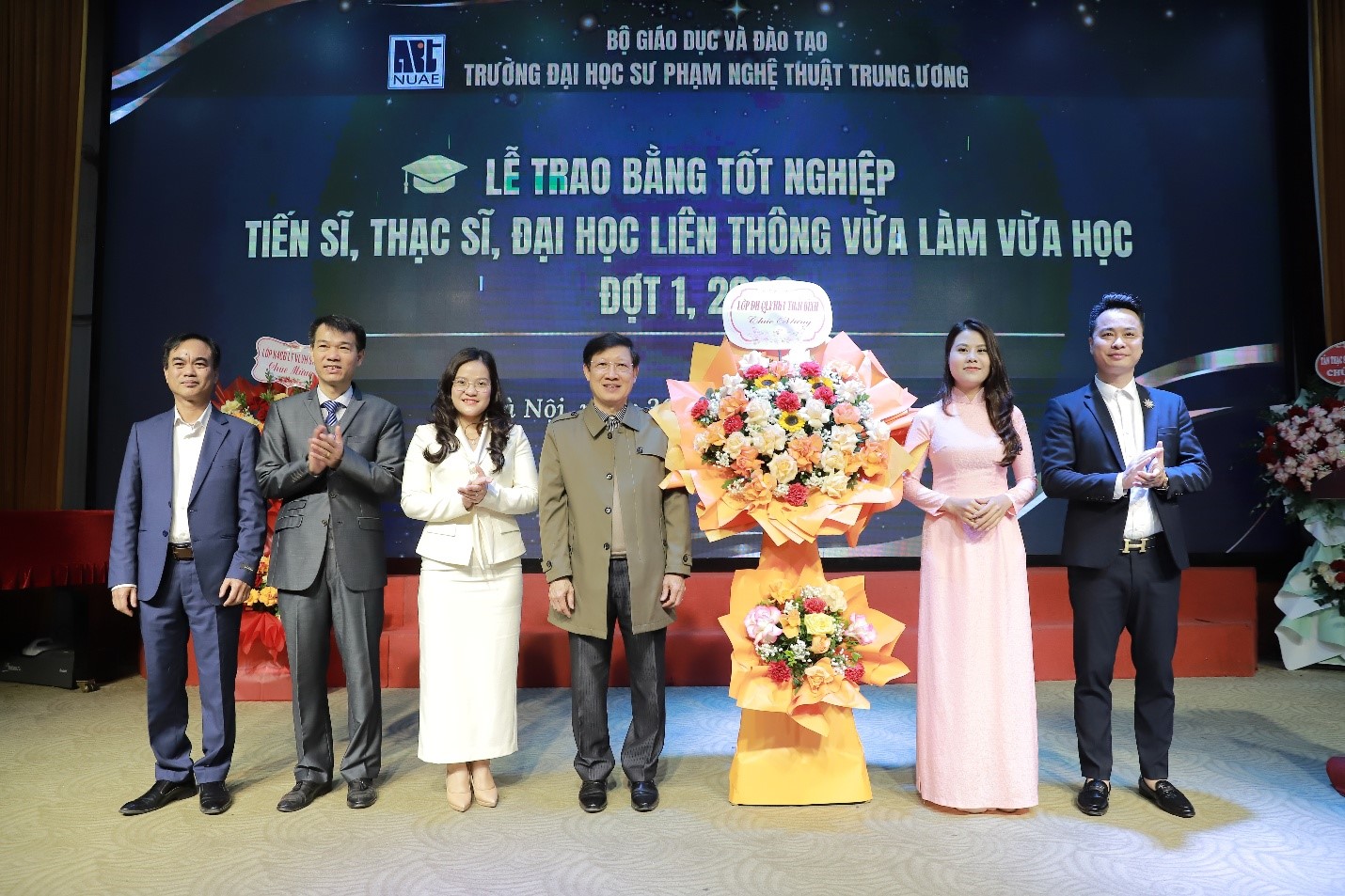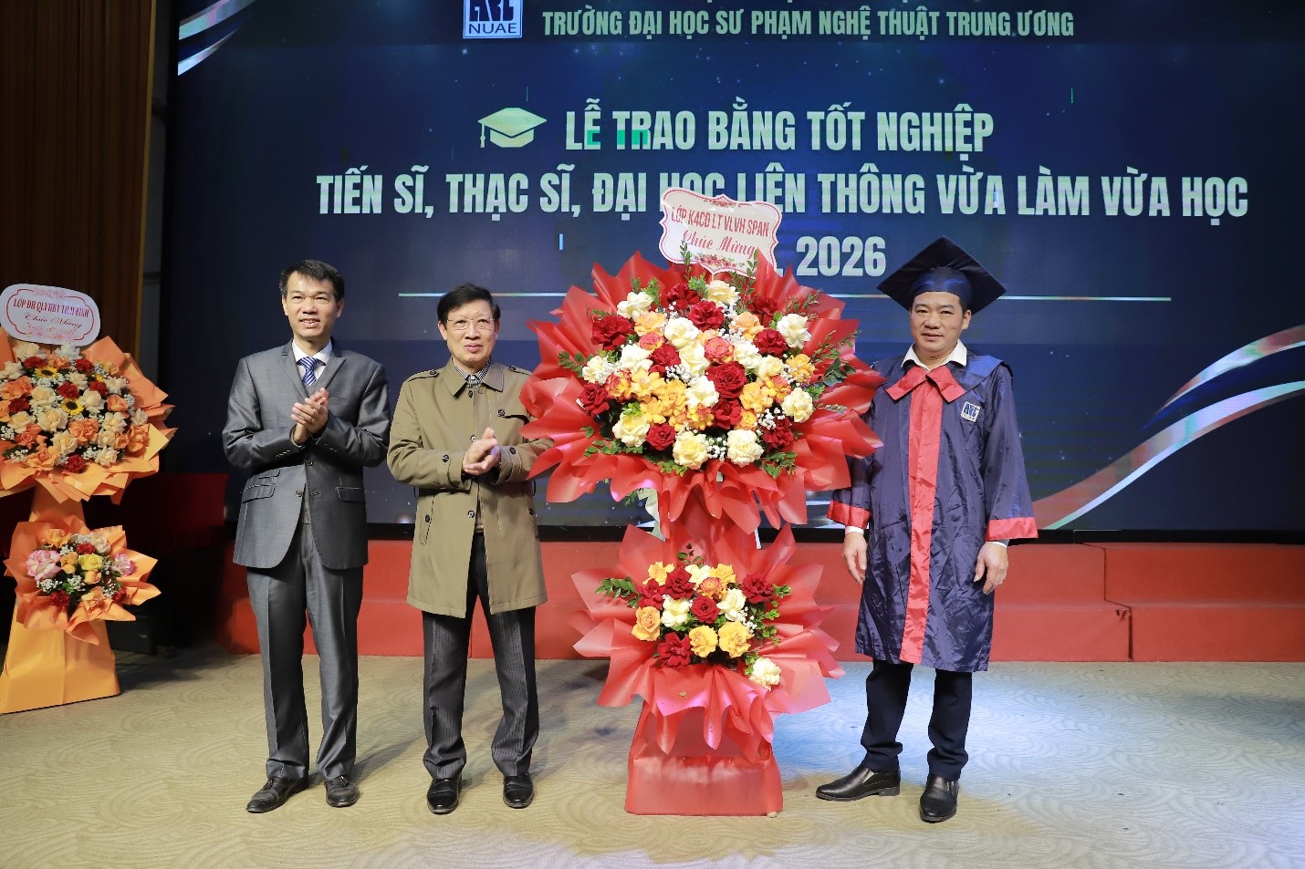 Đai diện tân Tiến sĩ, Thạc sĩ và tân Cử nhân nhận tặng hoa lãnh đạo Nhà trường tại buổi Lễ