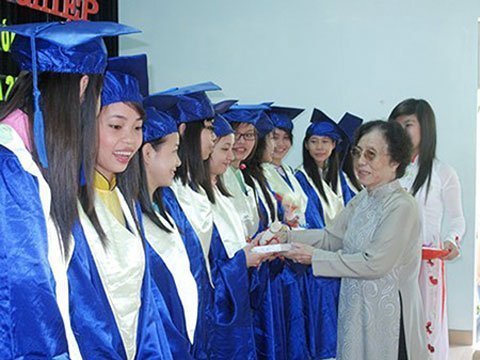 | Nguyên Phó Chủ tịch Nước Nguyễn Thị Bình tặng thưởng cho sinh viên ĐH Phan Châu Trinh. |