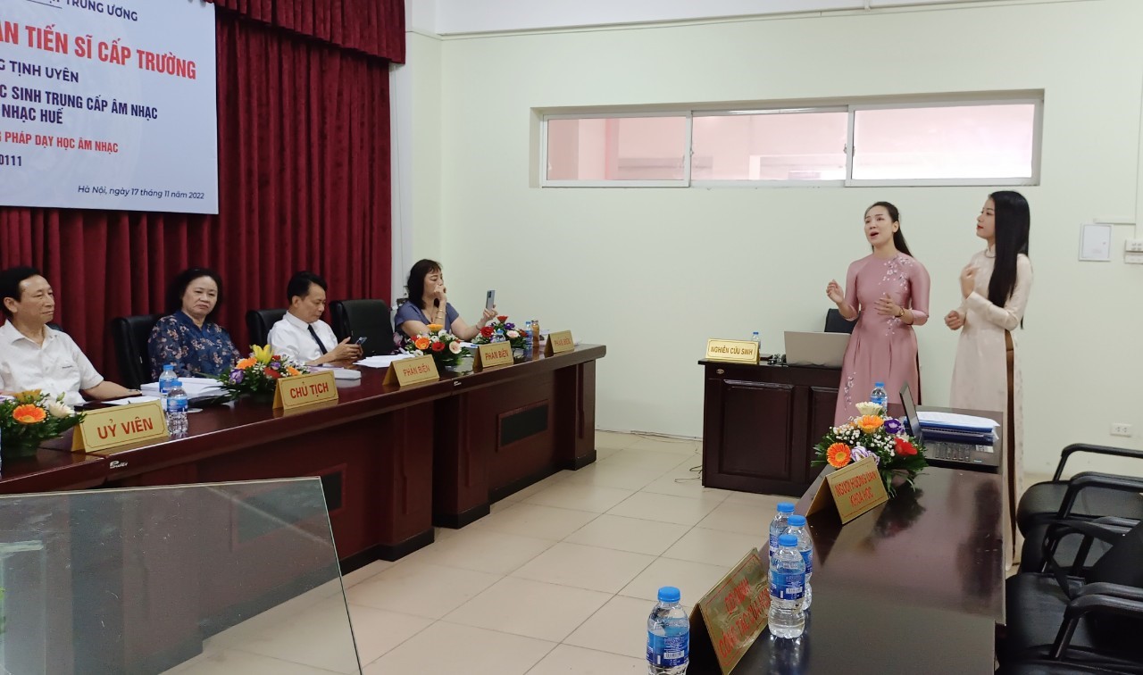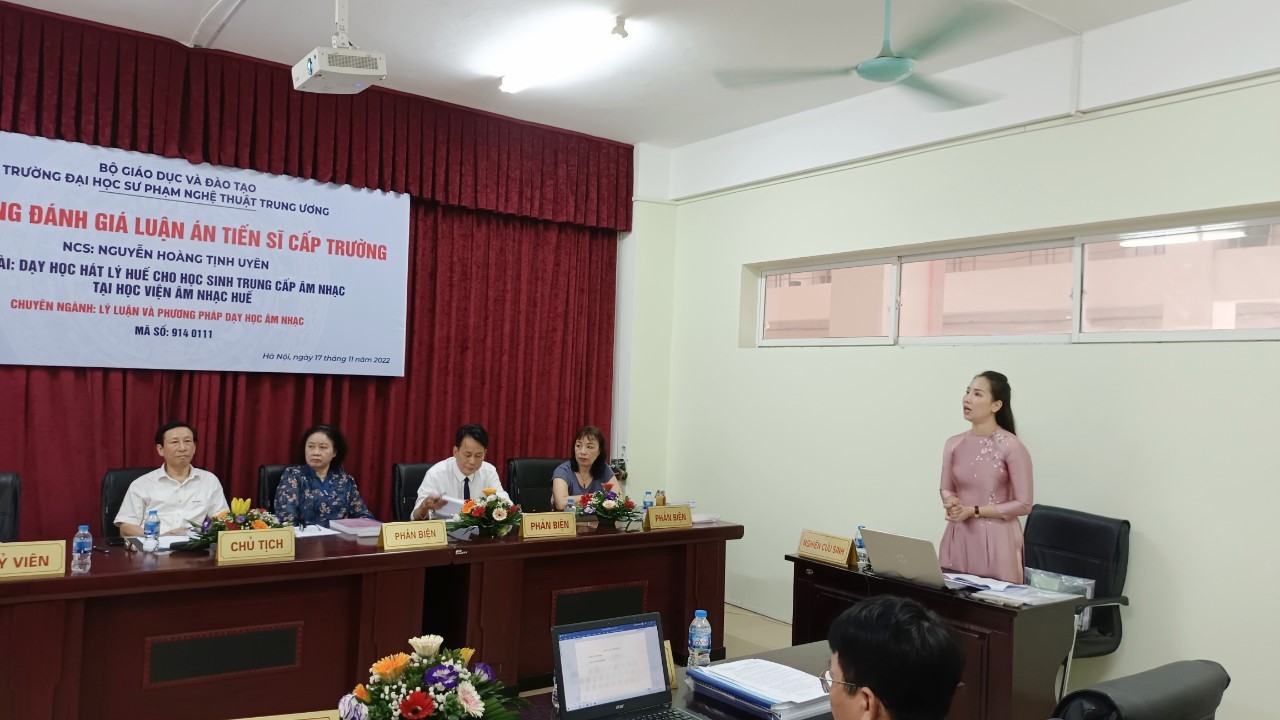 NUAE – Sáng ngày 17/11/2022, tại khoa Sau Đại học, Trường ĐHSP Nghệ thuật TW, nghiên cứu sinh (NCS) Nguyễn Hoàng Tịnh Uyên đã bảo vệ thành công luận án tiến sĩ cấp Trường chuyên ngành Lý luận và phương pháp dạy học Âm nhạc, mã số: 9140111 với đề tài “Dạy học hát Lý Huế cho học sinh Trung cấp Âm nhạc tại Học viện Âm nhạc Huế”, dưới sự hướng dẫn khoa học của PGS.TS. Nguyễn Đăng Nghị.