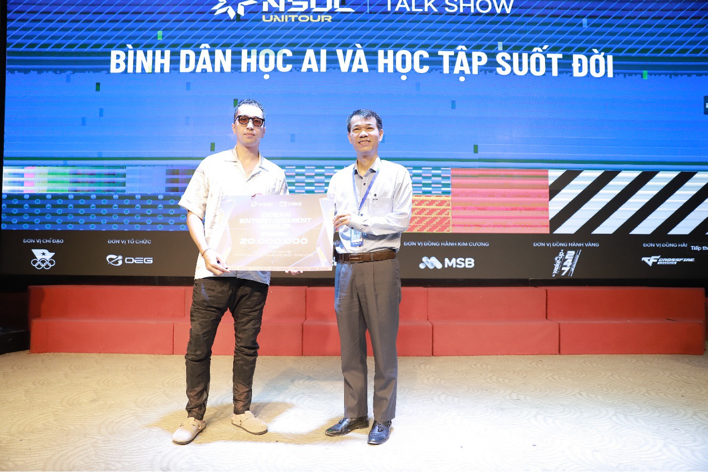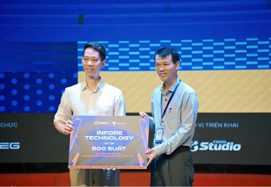 PGS.TS. Lê Vinh Hưng – Phó Bí thư Đảng ủy, Hiệu trưởng NUAE đại diện Nhà trường nhận học bổng từ Ban Tổ chức NSOC Unitour 2025 và CEO InfoRe Lê Công Thành