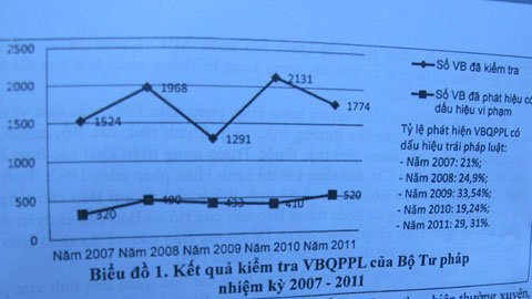 Tỉ lệ phát hiện các văn bản có dấu hiệu trái pháp luật những năm gần đây không giảm: năm 2007: 21%, 2008 24,9%, 2009 33,54%, 2010 19,24%, 2011 là 29,31%.