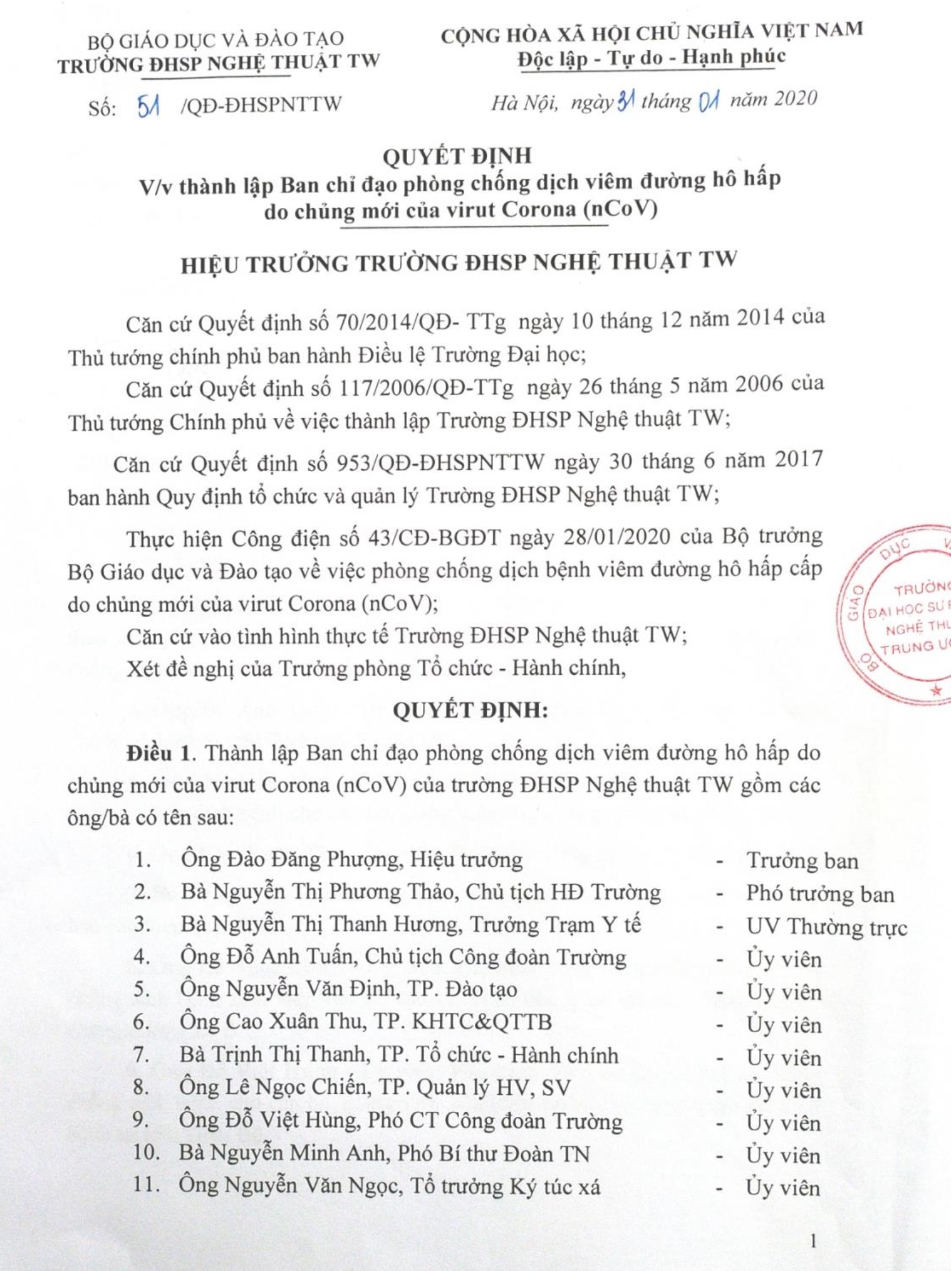 Quyết định thành lập Ban chỉ đạo phòng chống dịch viêm đường hô hấp do chủng mới của virus Corona (nCoV)
