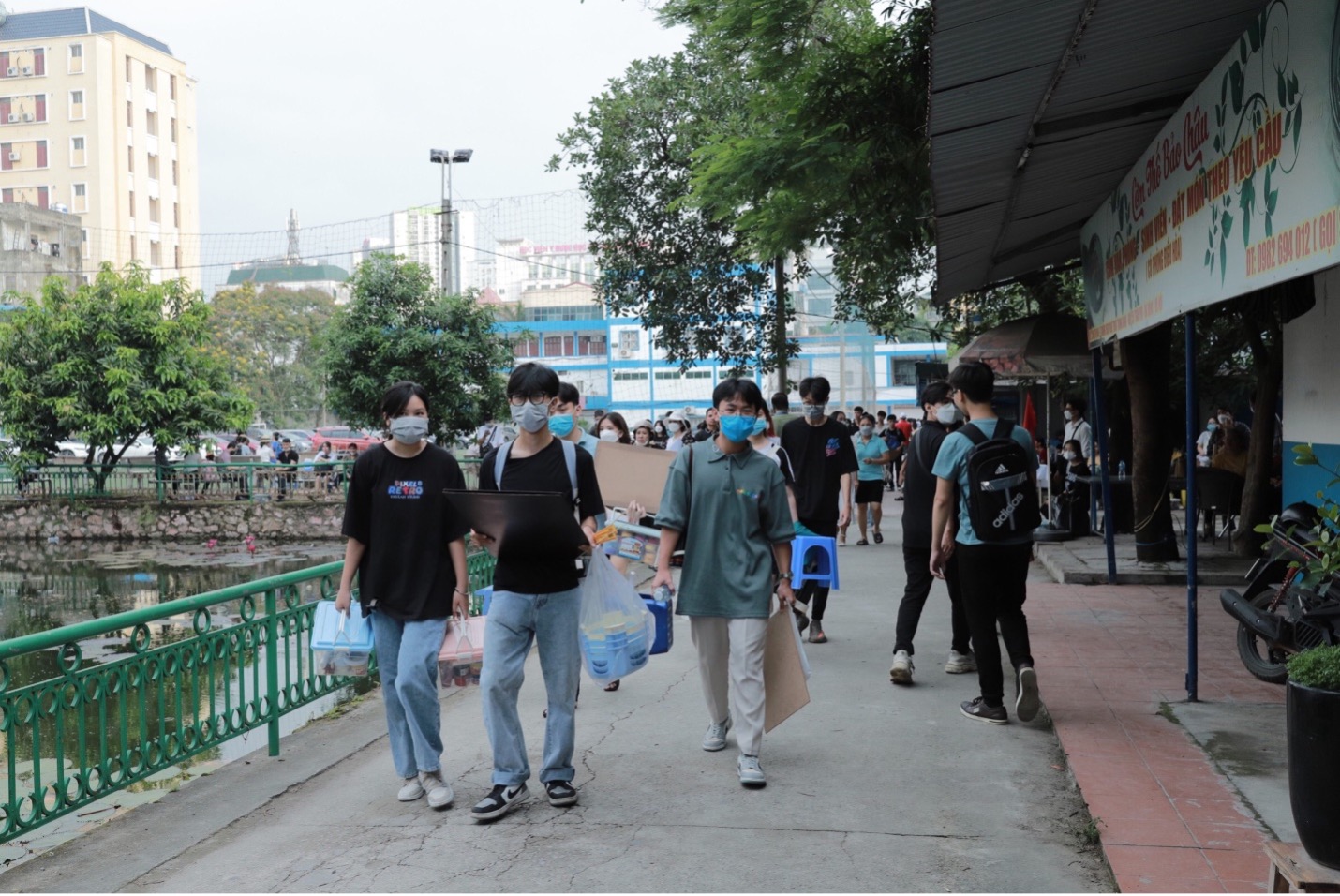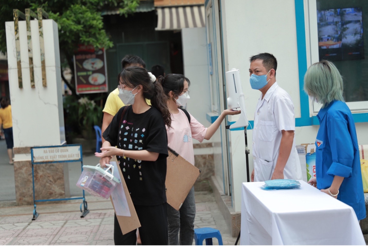 Thí sinh tụ tập đông đúc trước khi bước vào điểm thi