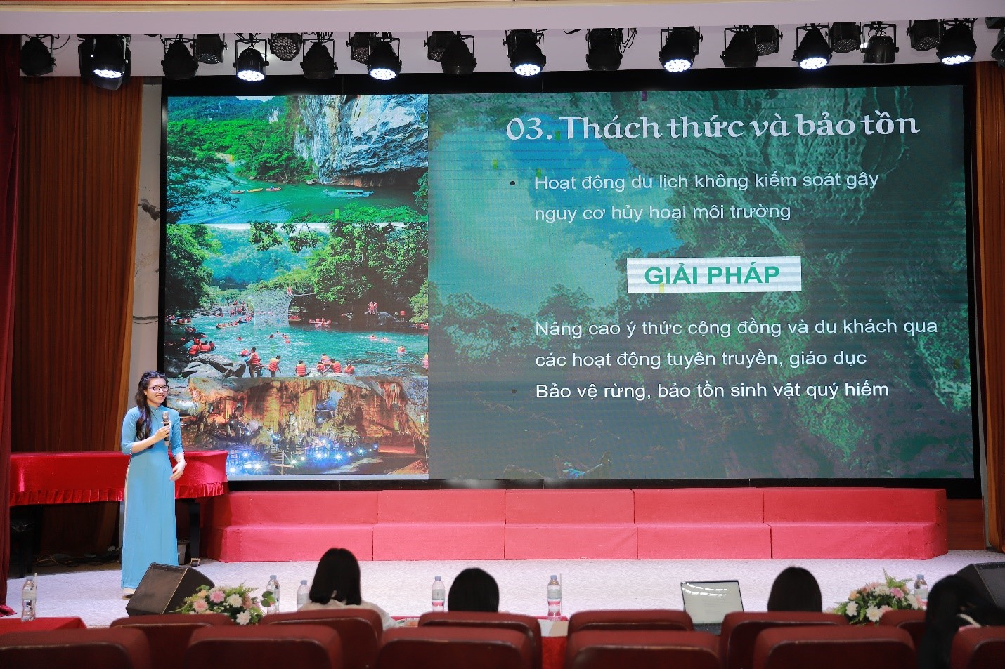 Trong buổi báo cáo, mỗi sinh viên đóng vai trò như một hướng dẫn viên chuyên nghiệp, trực tiếp giới thiệu, thuyết minh về các điểm đến, lịch sử, văn hóa và đặc trưng vùng miền. Ngoài ra, các em còn phải xử lý linh hoạt các tình huống nghiệp vụ mà hội đồng đặt ra nhằm đánh giá kỹ năng giải quyết vấn đề, giao tiếp và xử lý khủng hoảng – những yếu tố không thể thiếu trong ngành dịch vụ – du lịch. Hội đồng chấm thi đánh giá cao sự chuẩn bị kỹ lưỡng, phong thái chuyên nghiệp cũng như tình yêu nghề mà các em thể hiện. Đồng thời, hội đồng cũng đưa ra những nhận xét mang tính định hướng để sinh viên có thể khắc phục hạn chế, hoàn thiện bản thân sau khi tốt nghiệp.