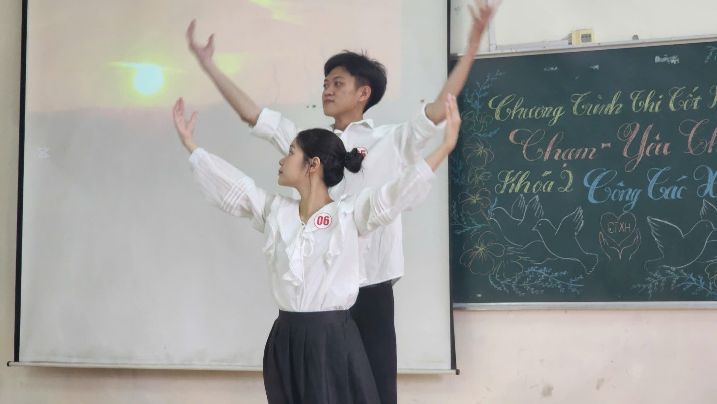 Thông qua âm nhạc, kịch nghệ, múa và hội họa, nhóm Chạm – Yêu thương đã khéo léo truyền tải thông điệp về yêu thương, về sự thức tỉnh và hành động; góp phần nâng cao nhận thức cộng đồng về việc nhận diện, phòng ngừa và can thiệp bạo lực gia đình, hướng tới xây dựng những mái ấm bình yên và hạnh phúc. Không chỉ là một buổi biểu diễn nghệ thuật, chương trình còn là một hành trình cảm xúc sâu sắc – nơi nghệ thuật đồng hành cùng công tác xã hội, chạm đến trái tim và lay động ý thức xã hội. Đây chính là minh chứng rõ nét cho định hướng đào tạo đặc thù và hiệu quả của Nhà trường trong việc lồng ghép văn hóa – nghệ thuật vào chương trình giảng dạy ngành Công tác xã hội.