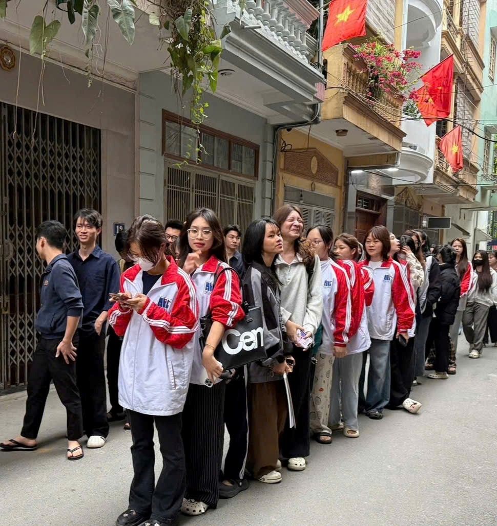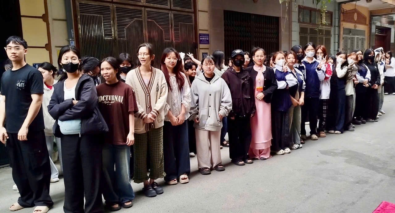 Sinh viên Trường ĐHSP Nghệ thuật TW xếp hàng trật tự, nghiêm túc chờ đến lượt thực hiện quyền bầu cử tại khu vực bỏ phiếu số 16, đơn vị bầu cử số 4 (phường Thanh Liệt, thành phố Hà Nội)