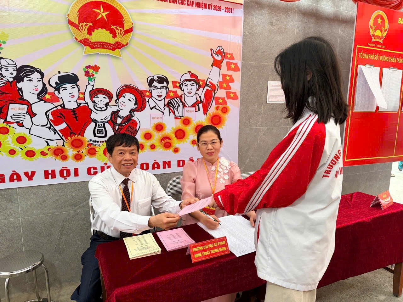 Sáng 15/3/2026, hòa cùng không khí nô nức của Ngày hội bầu cử trên cả nước, khu vực bỏ phiếu số 16, đơn vị bầu cử số 4 (phường Thanh Liệt, thành phố Hà Nội) trở nên rộn ràng với sự tham gia bỏ phiếu của đông đảo sinh viên Trường ĐHSP Nghệ thuật TW.