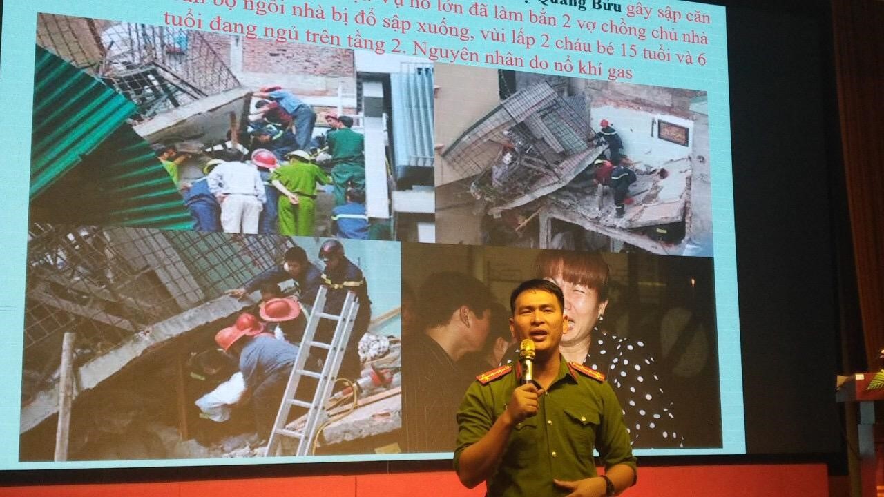 Đồng chí Phạm Văn Trưởng – Cán bộ kiểm tra an toàn PCCC, Đội Cảnh sát PCCC&CNCH phổ biến kiến thức về phòng chống cháy nổ tại Buổi tập huấn