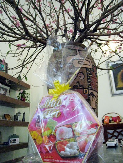 | Dưới cành đào to trong căn phòng khách nhà Đại sứ là một hộp mứt Tết truyền thống |