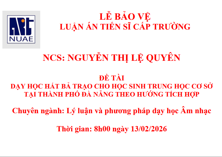 THÔNG BÁO LỄ BẢO VỆ LUẬN ÁN TIẾN SĨ CẤP TRƯỜNG NCS: NGUYỄN THỊ LỆ QUYÊN. ĐỀ TÀI DẠY HỌC HÁT BẢ TRẠO CHO HỌC SINH TRUNG HỌC CƠ SỞ TẠI THÀNH PHỐ ĐÀ NẴNG THEO HƯỚNG TÍCH HỢP