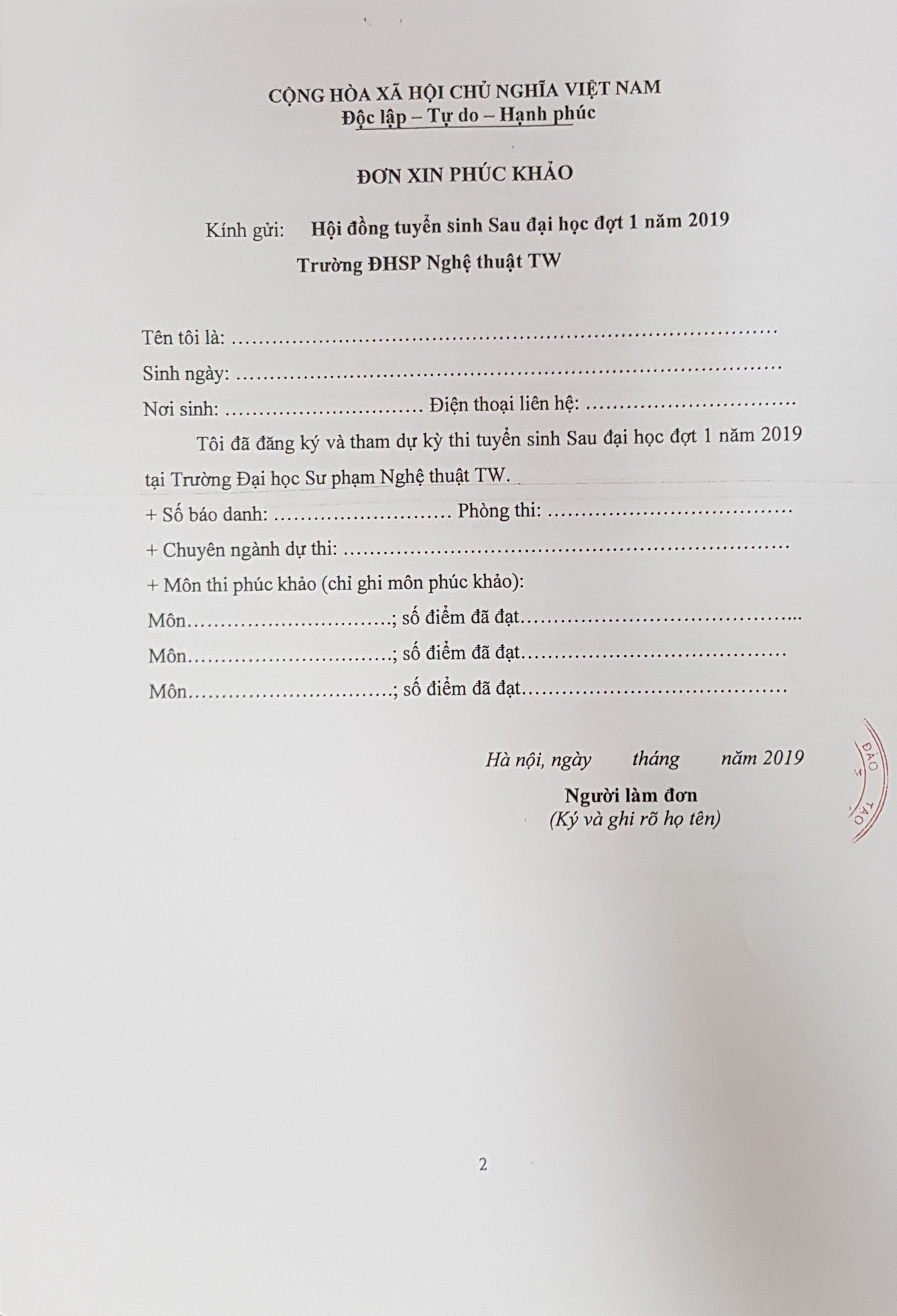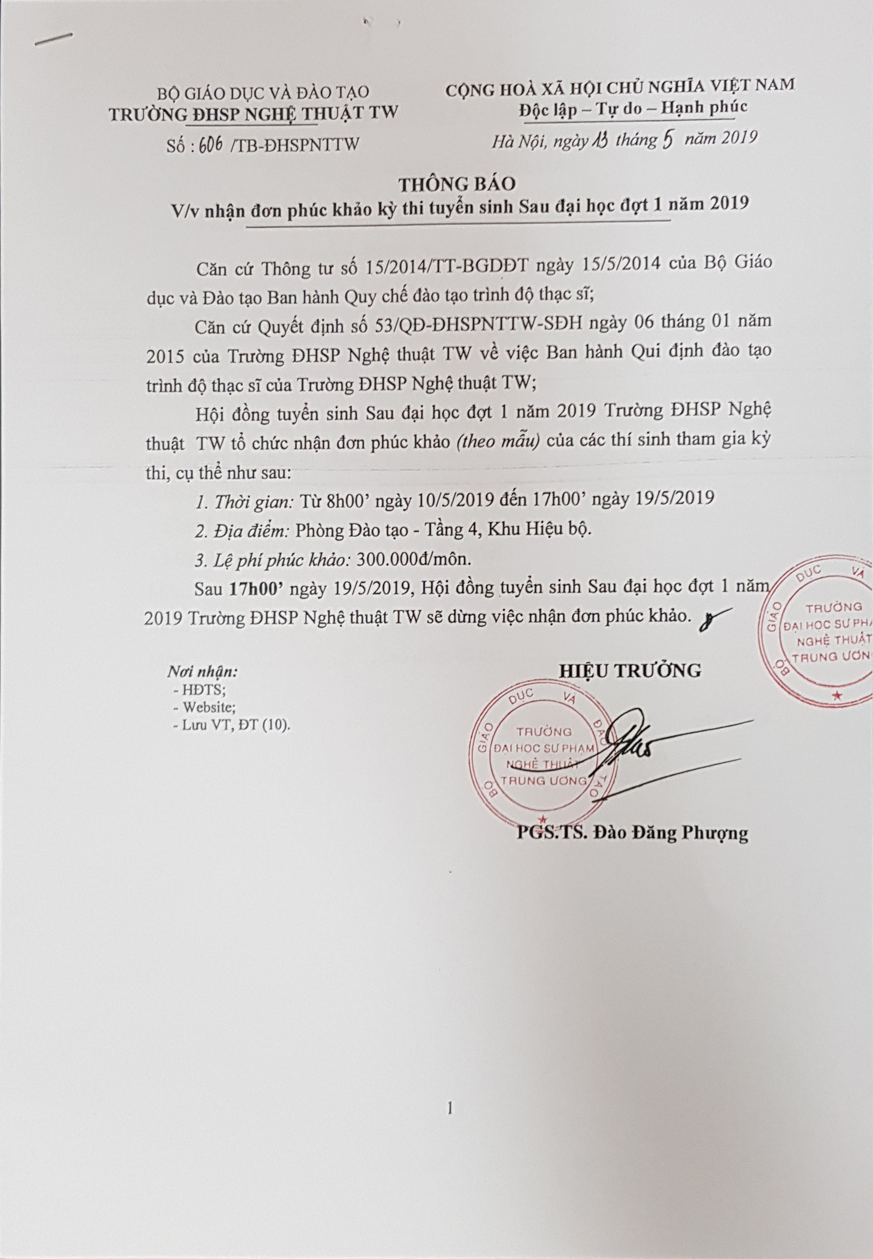 THÔNG BÁO V/v nhận đơn phúc khảo kỳ thi tuyển sinh Sau đại học đợt 1 năm 2019