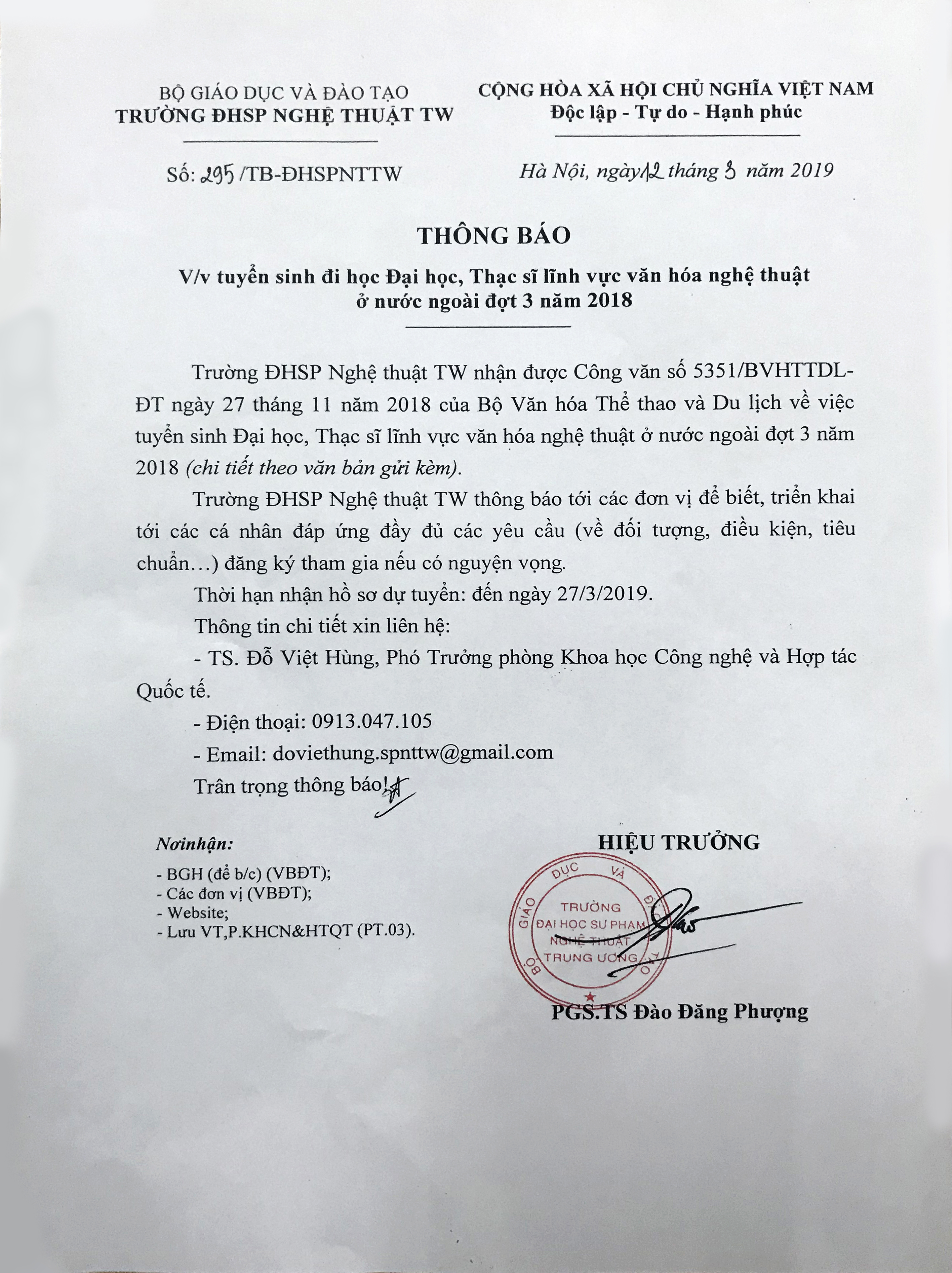 THÔNG BÁO V/v tuyển sinh đi học Đại học, Thạc sĩ lĩnh vực văn hóa nghệ thuật ở nước ngoài đợt 3 năm 2018