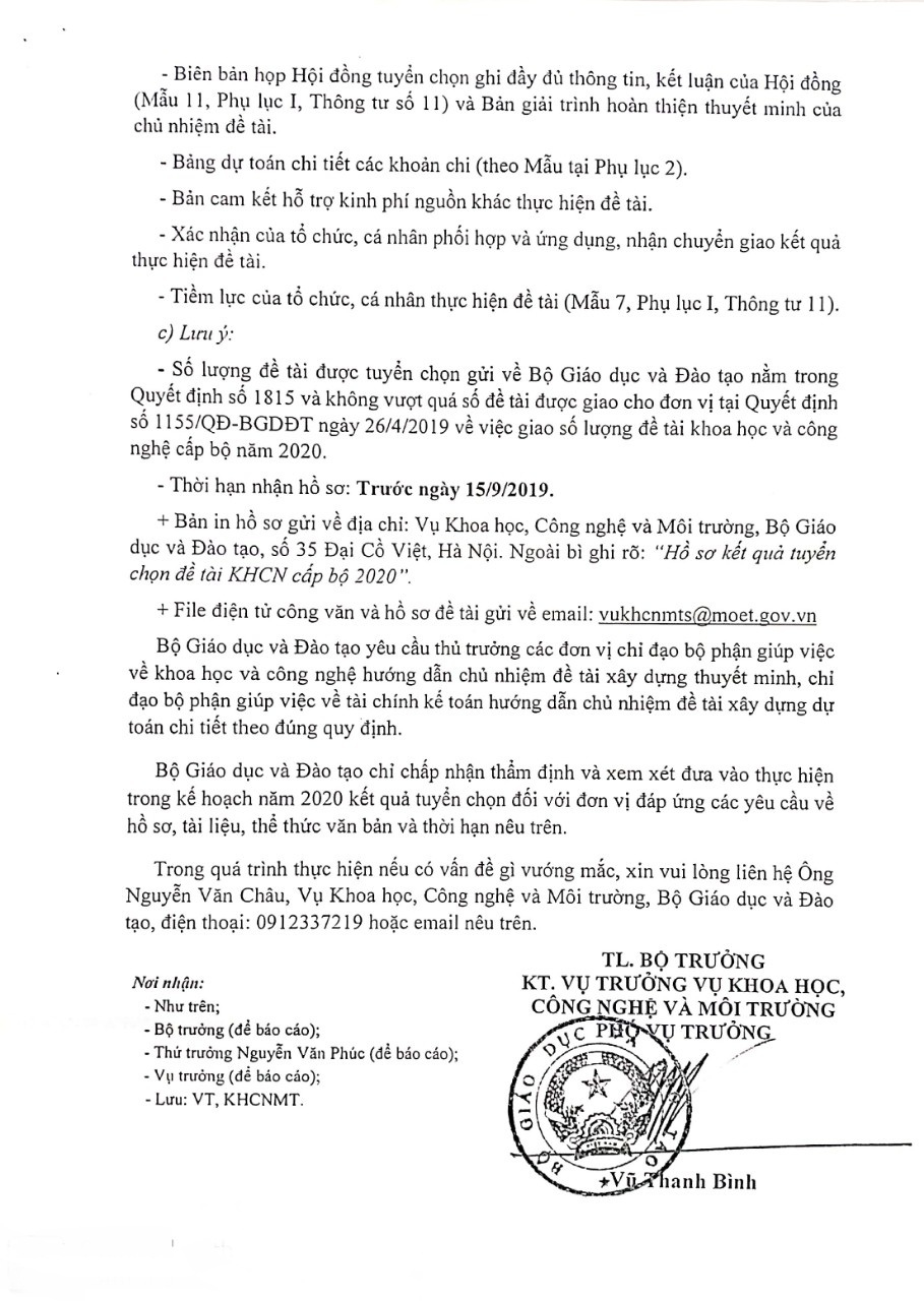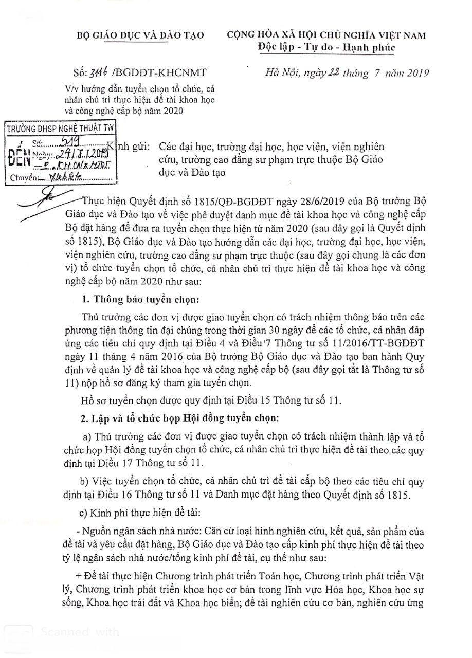 THÔNG BÁO về việc hướng dẫn tuyển chọn tổ chức, cá nhân chủ trì thực hiện đề tài khoa học và công nghệ cấp Bộ năm 2020
