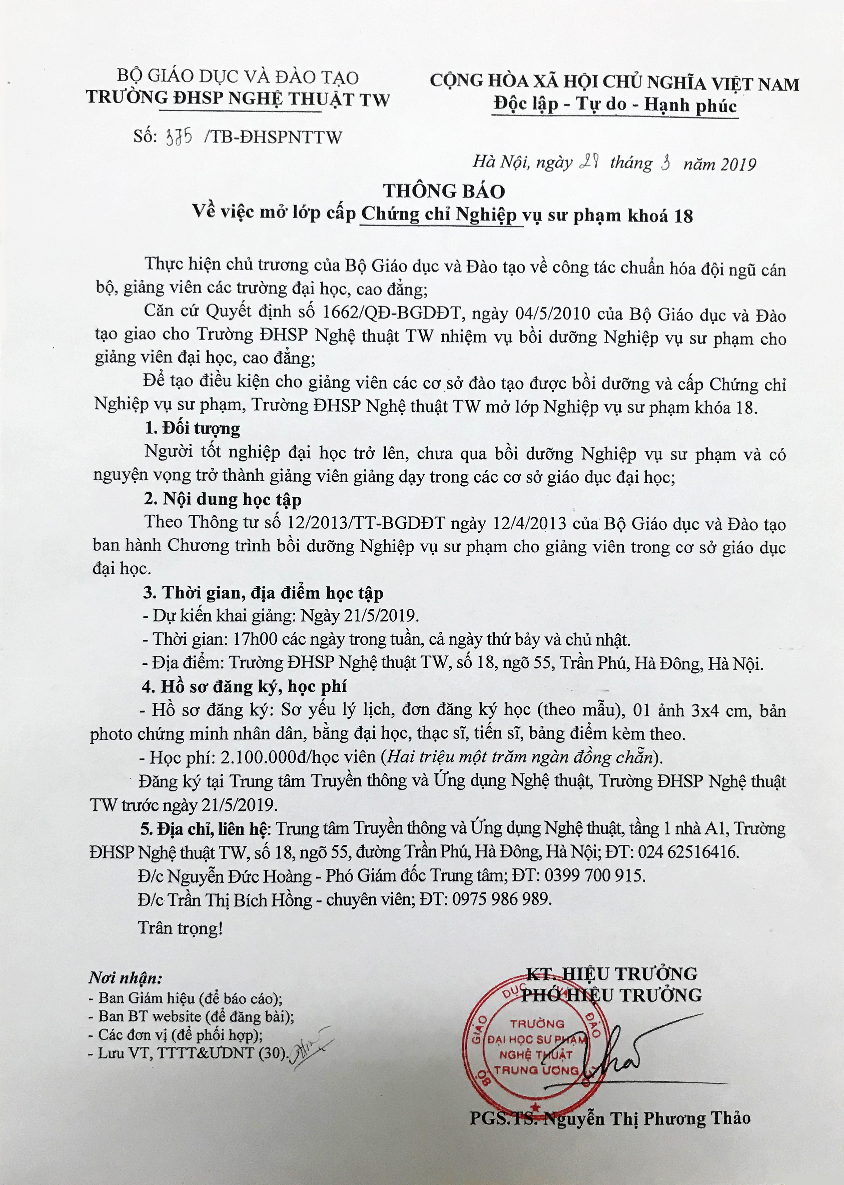 THÔNG BÁO Về việc mở lớp cấp Chứng chỉ Nghiệp vụ sư phạm khóa 18